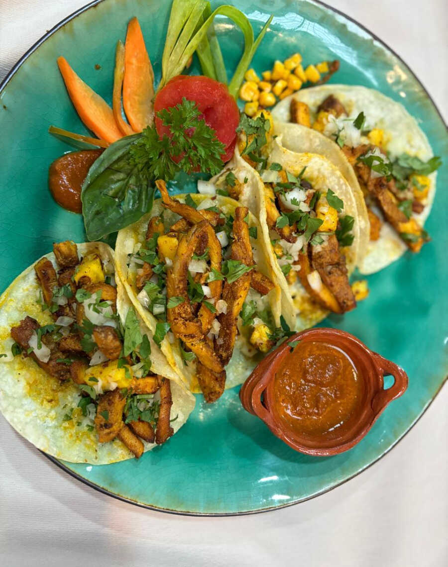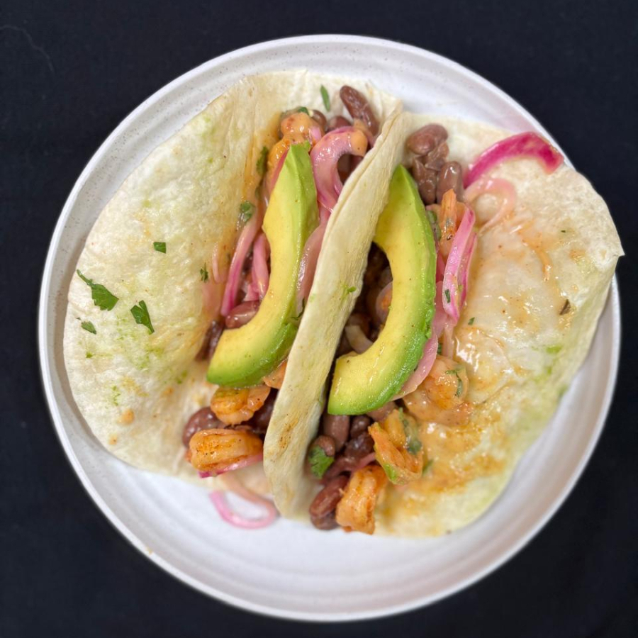 Tortillas suaves con camarones salteados a la plancha, sazonados con especias ligeras y acompañados de repollo fresco.