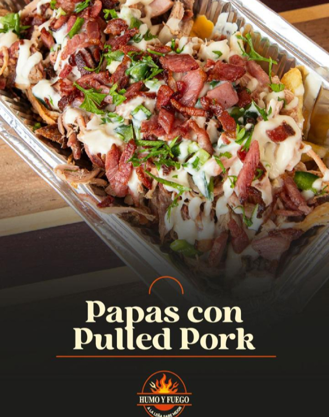 Papas fritas con pulled pork ahumado, queso cheddar, tomate, tocineta, natilla casera y un toque de jalapeños para encender el sabor.