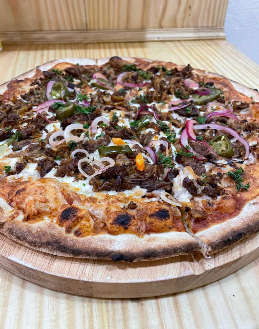 Birria, jalapeño, queso y nuestra deliciosa salsa para pizza.