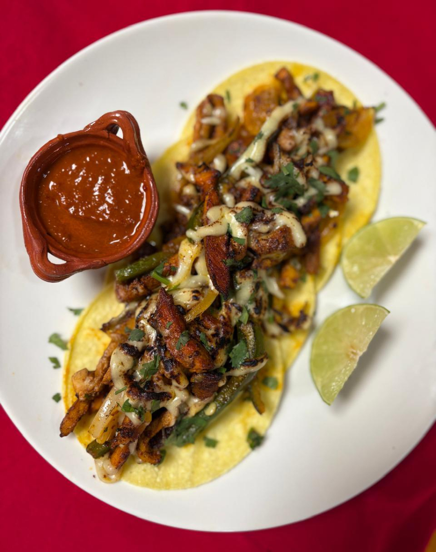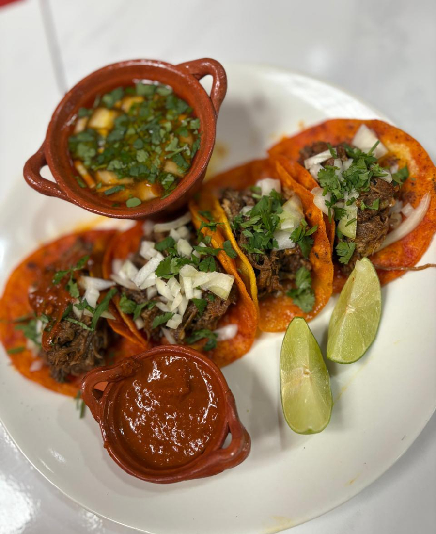 Tortillas calientes rellenas de jugosa carne de res cocida lentamente en un consomé especiado con chiles secos.
