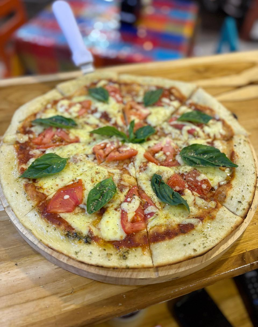 Queso, tomate y albahaca con nuestra deliciosa salsa para pizza.