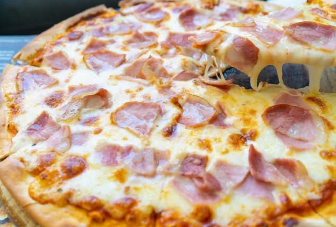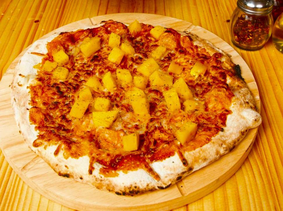 Piña, salami, jamón, queso y nuestra deliciosa salsa para pizza.