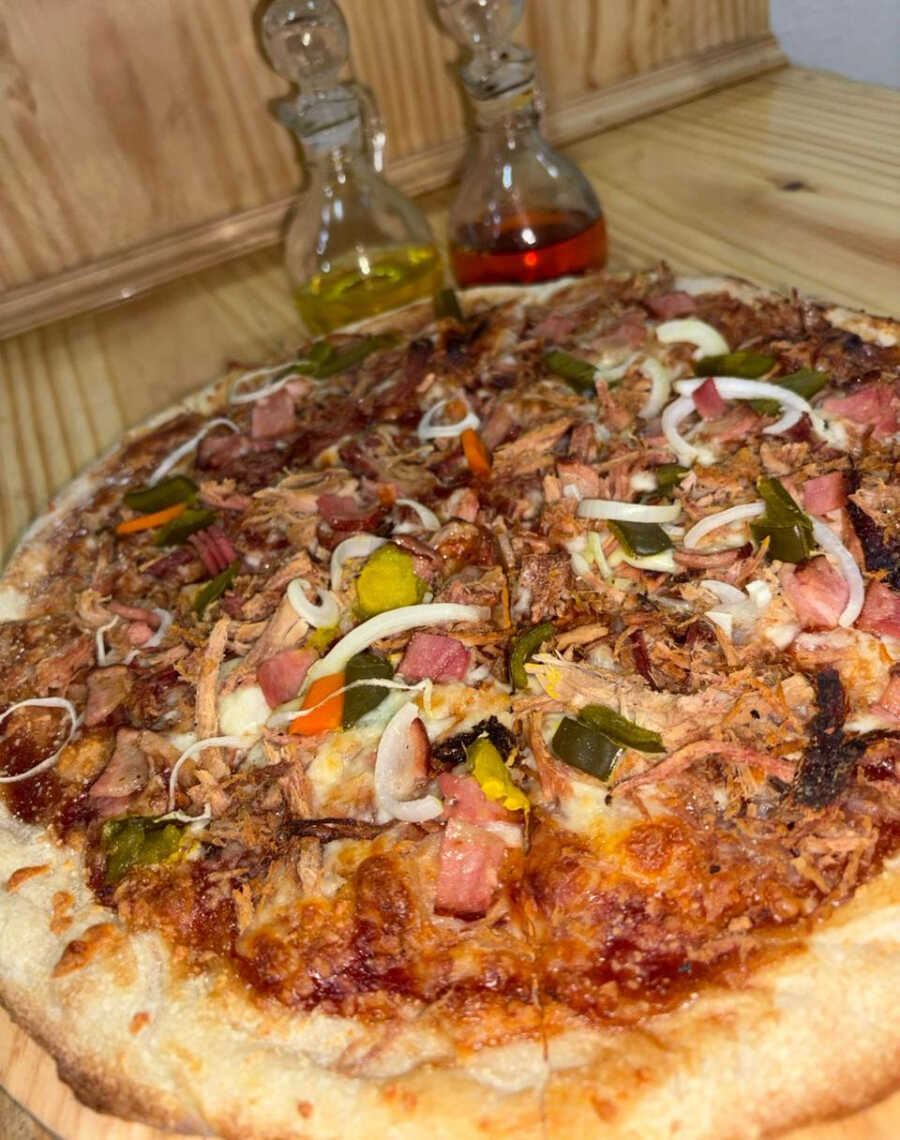 Carne de res, tocineta, peperoni, aceitunas, alcaparras, chile dulce, cebolla, queso y nuestra deliciosa salsa para pizza.