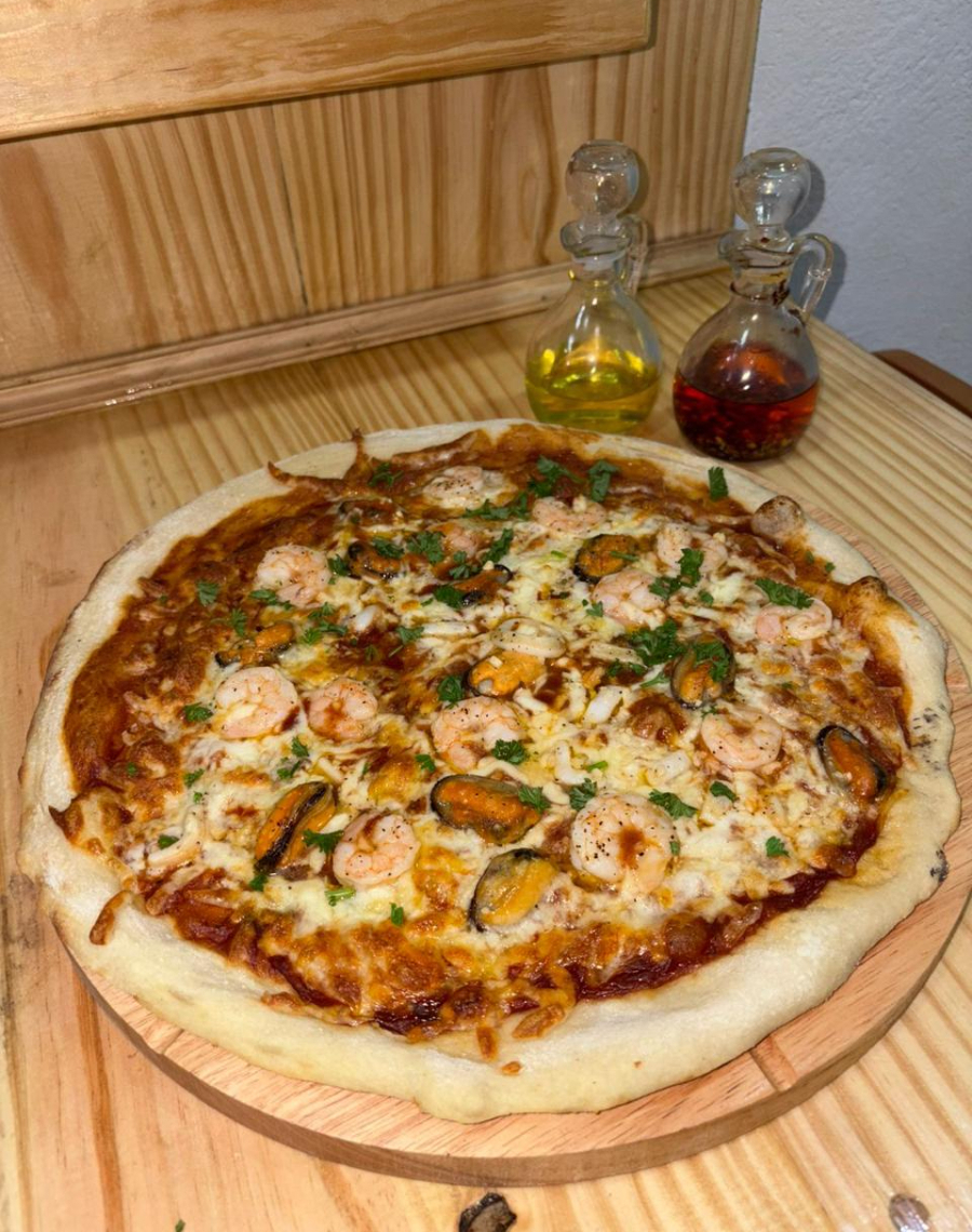 Camarones, mejillones, calamares, limón, perejil, queso y salsa de tomate especial.