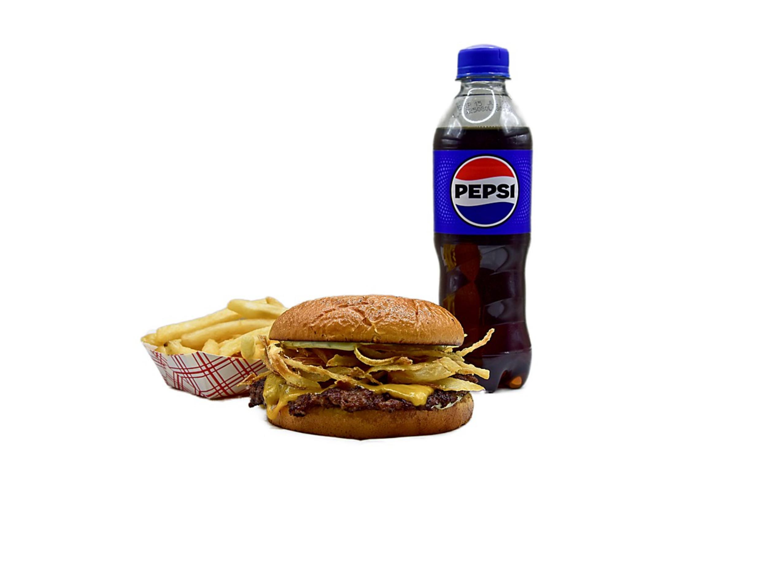 1 Classic Smashburger (1 Torta de carne Angus (100g), pan brioche, cebolla crispy y queso con salsa Hungry y de ajo ) con papas fritas y 1 Pepsi de 355ml