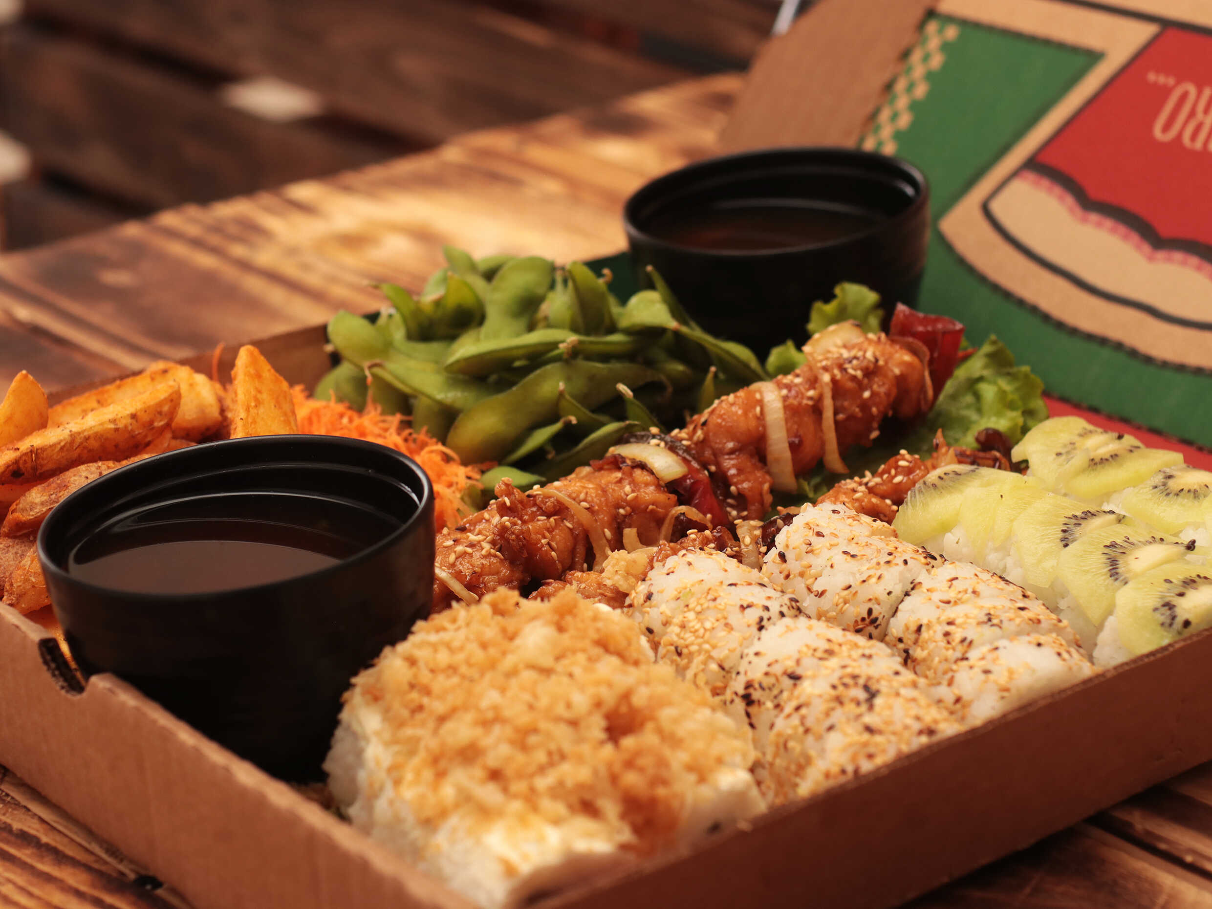 30 Piezas, 2 pinchos teriyaki, orden de edamames, 3 sopas miso, salsas de la casa y una orden de papas con queso cheddar.