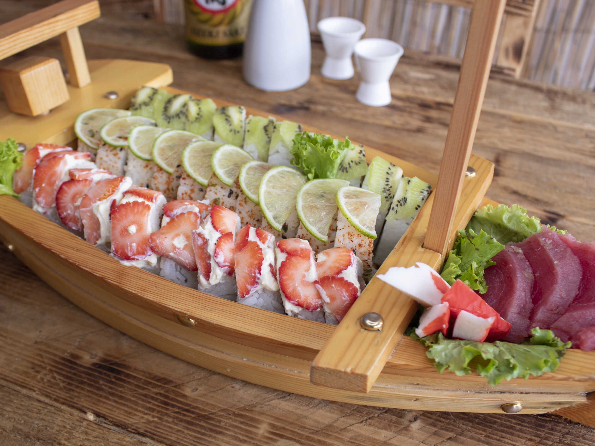 Kanikama, pepino, aguacate y zanahoria, acompañado de cortes de atún, marlin, salmón y pulpo con polvo picante y aderezo spicy.