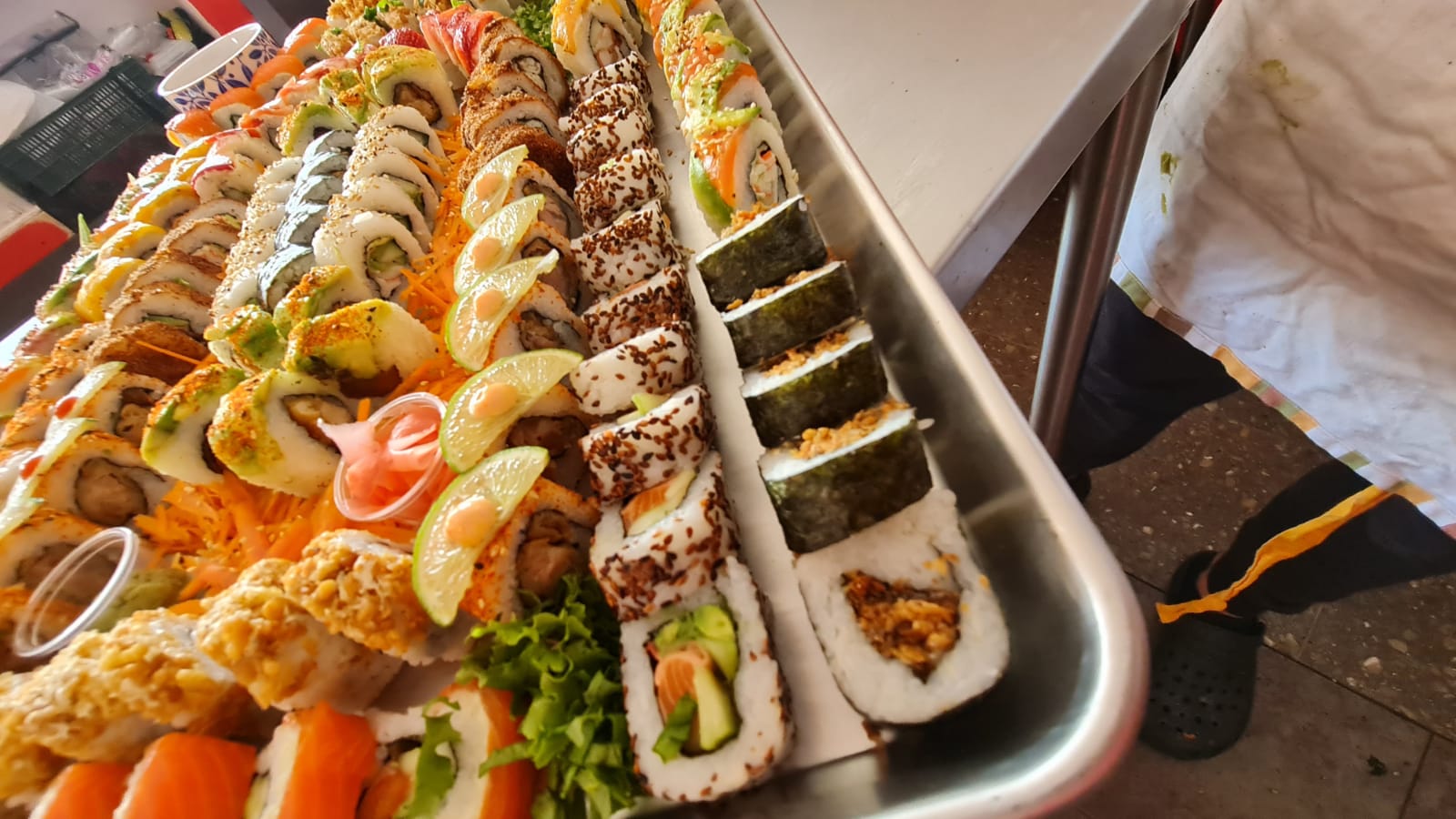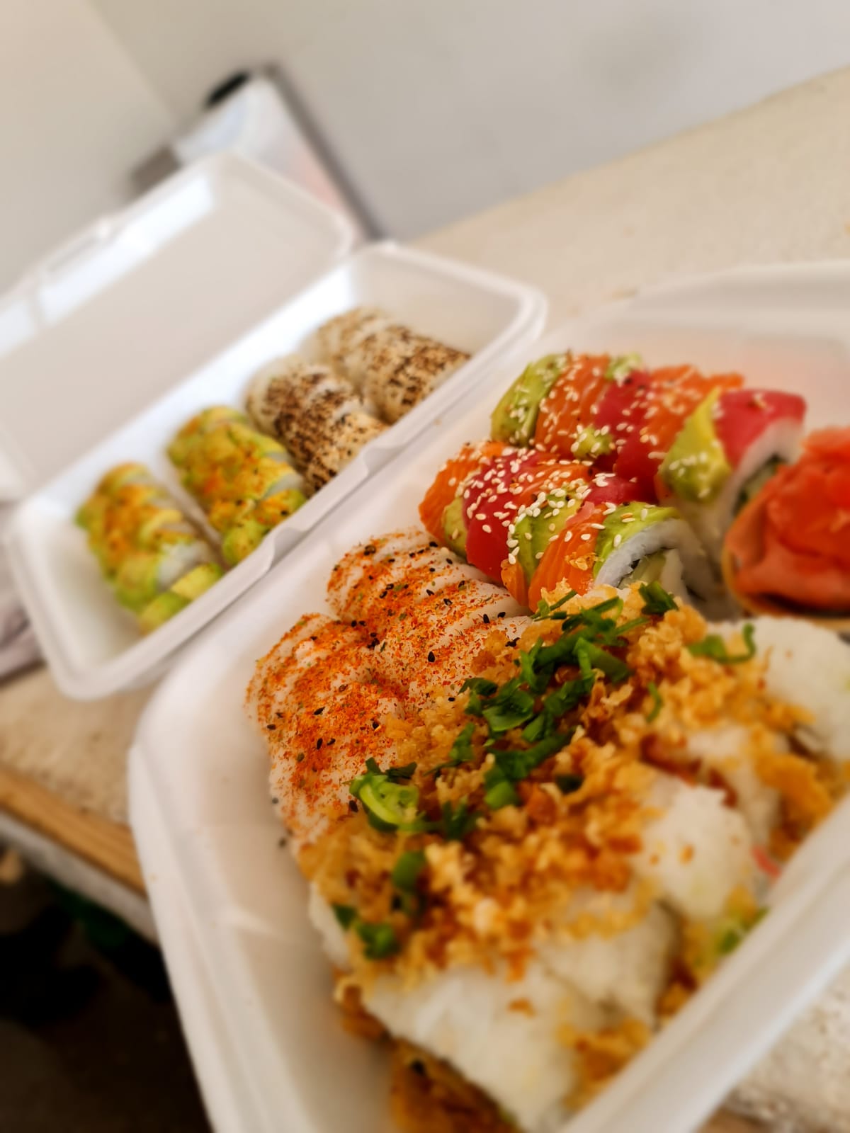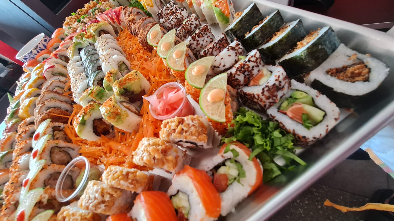 60 piezas de sushi ya establecido Tempura makki. Tico roll. California. Cream deluxe. Ichiraku Roll. Spyci tuna