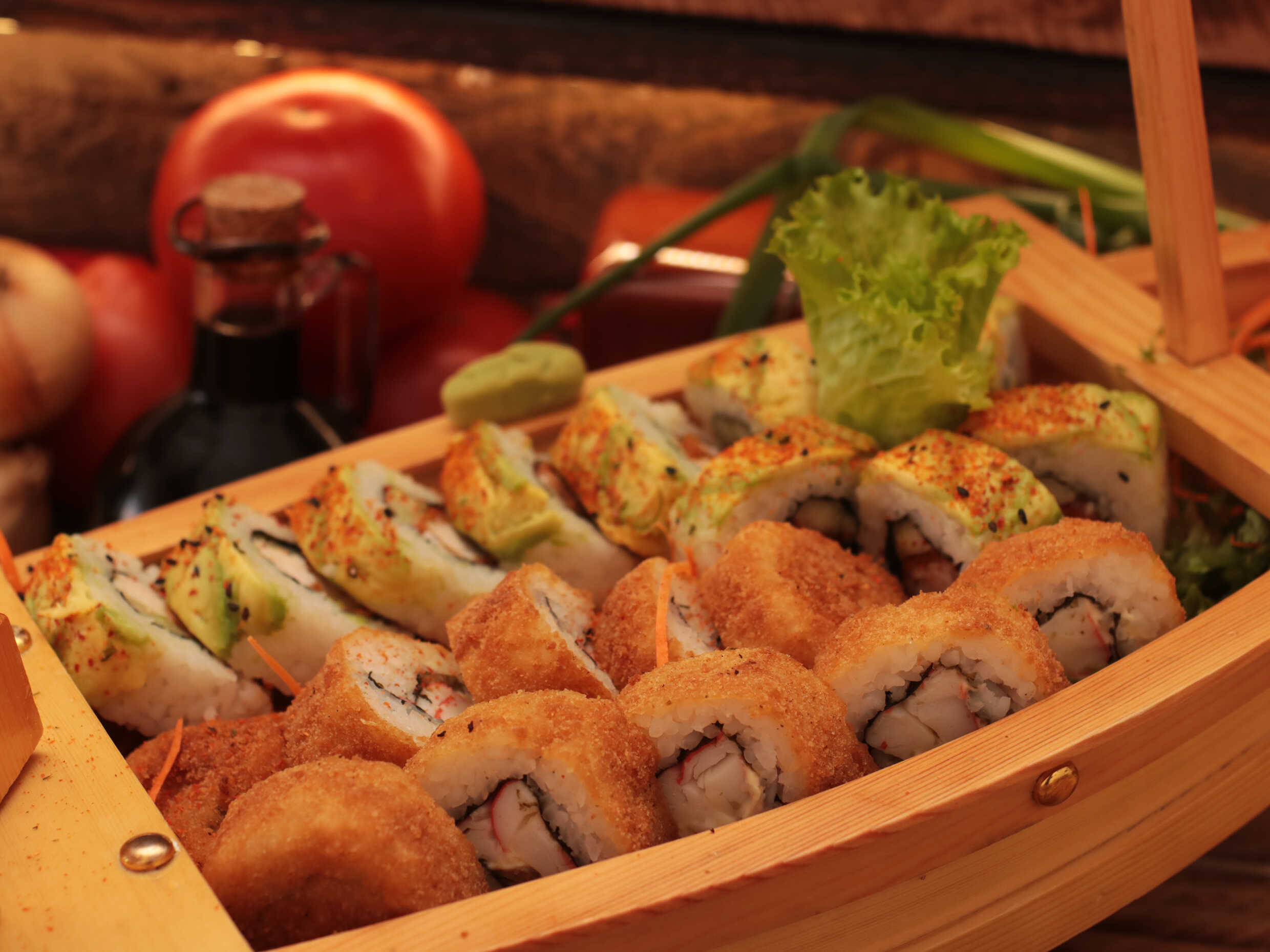 Aguacate, cebollino, pepino y camarón empanizado, cubierto de masago y furikake de salmón.