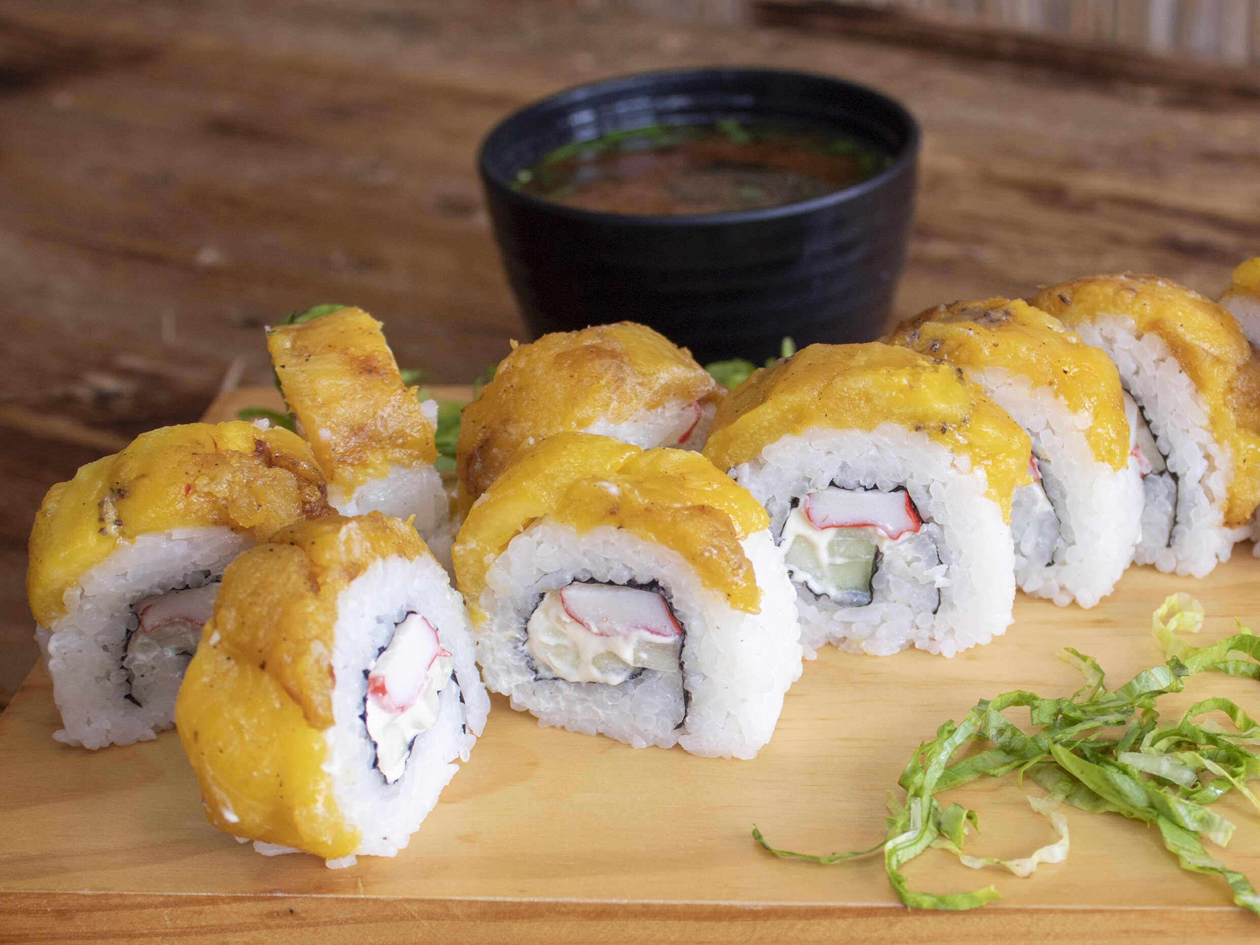 Pescado tempura, aguacate y kanikama, cubierto de plátano maduro, rollo empanizado