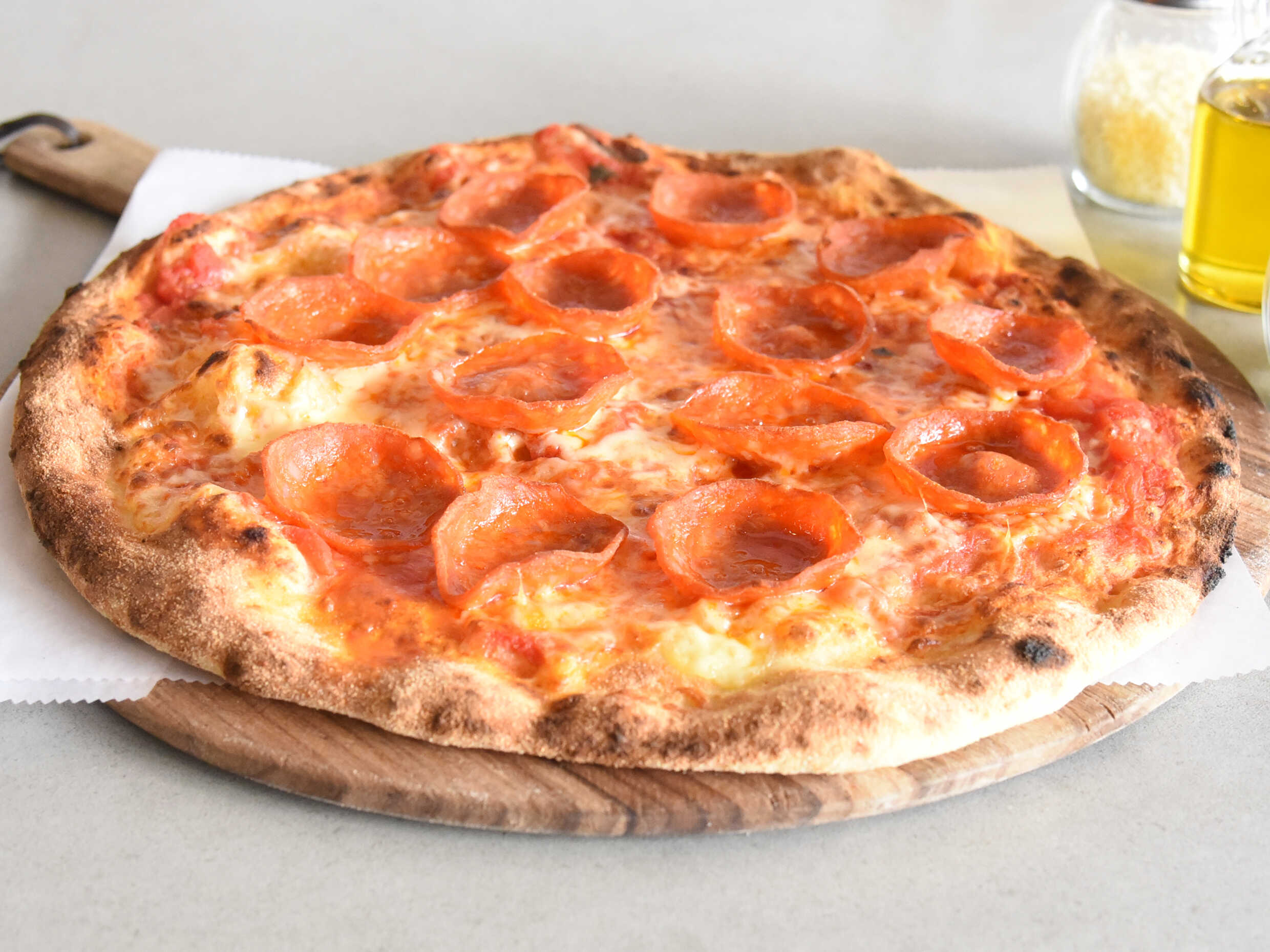 Salsa de tomate natural, queso mozzarella y pepperoni.