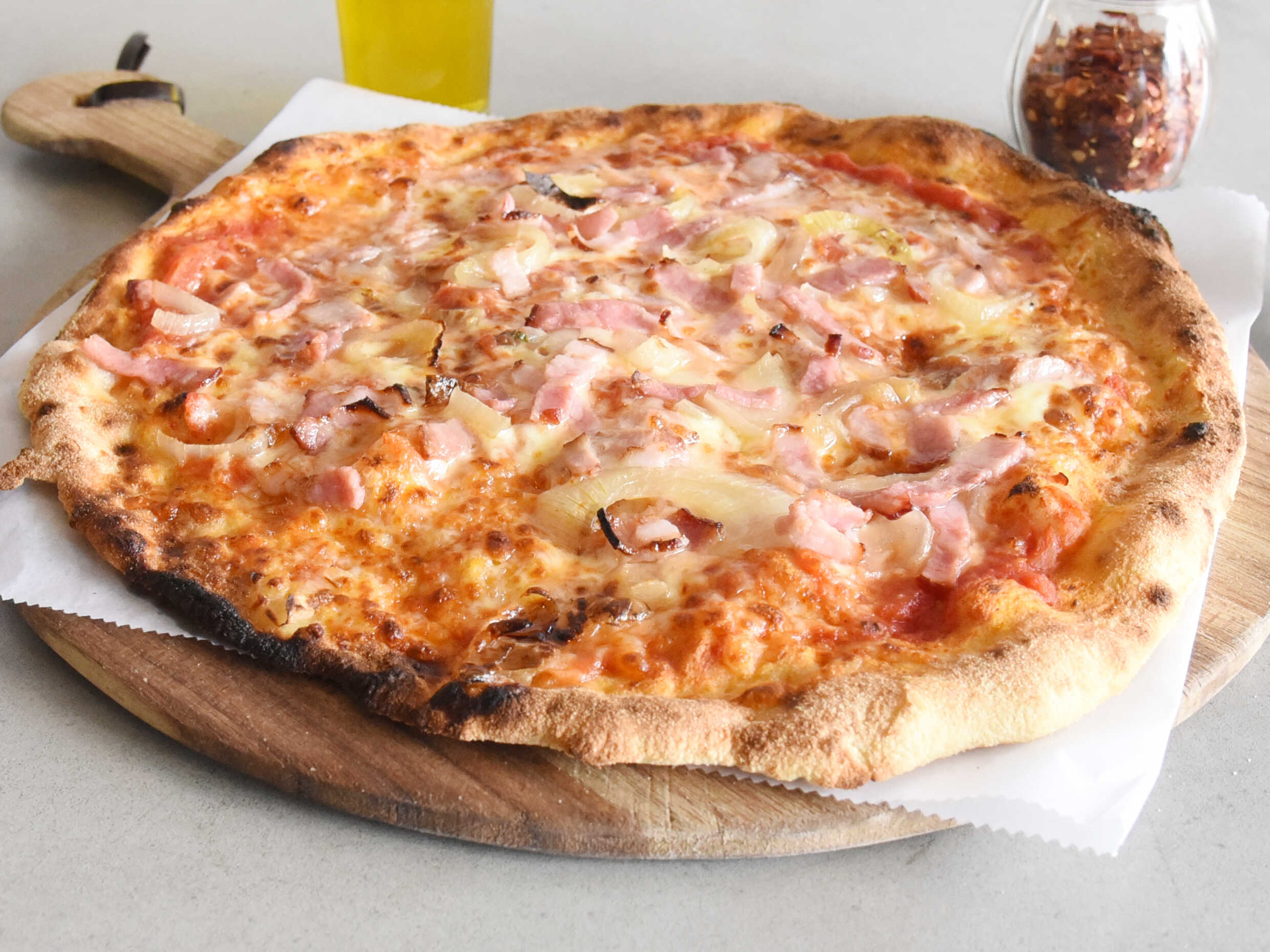 Salsa de tomate natural, queso mozzarella, tocineta ahumada y cebolla caramelizada al horno.