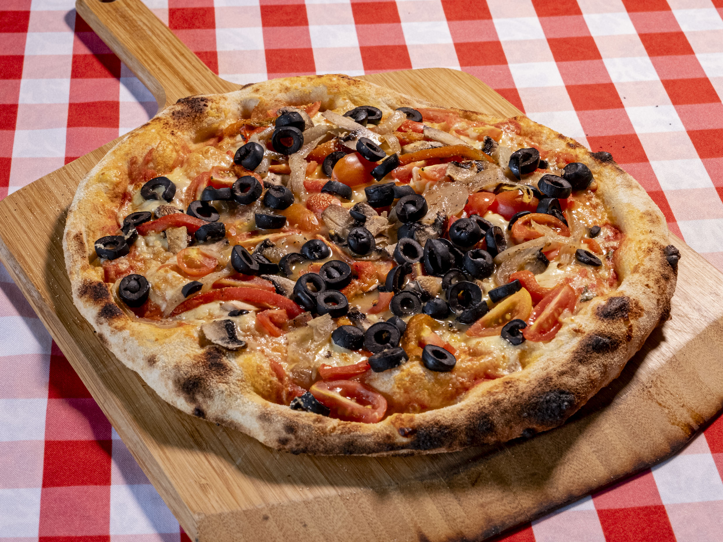 Salsa de tomate natural, queso mozzarella, chile asado, cebolla caramelizada, aceituna negra, tomate cherry y albahaca fresca.