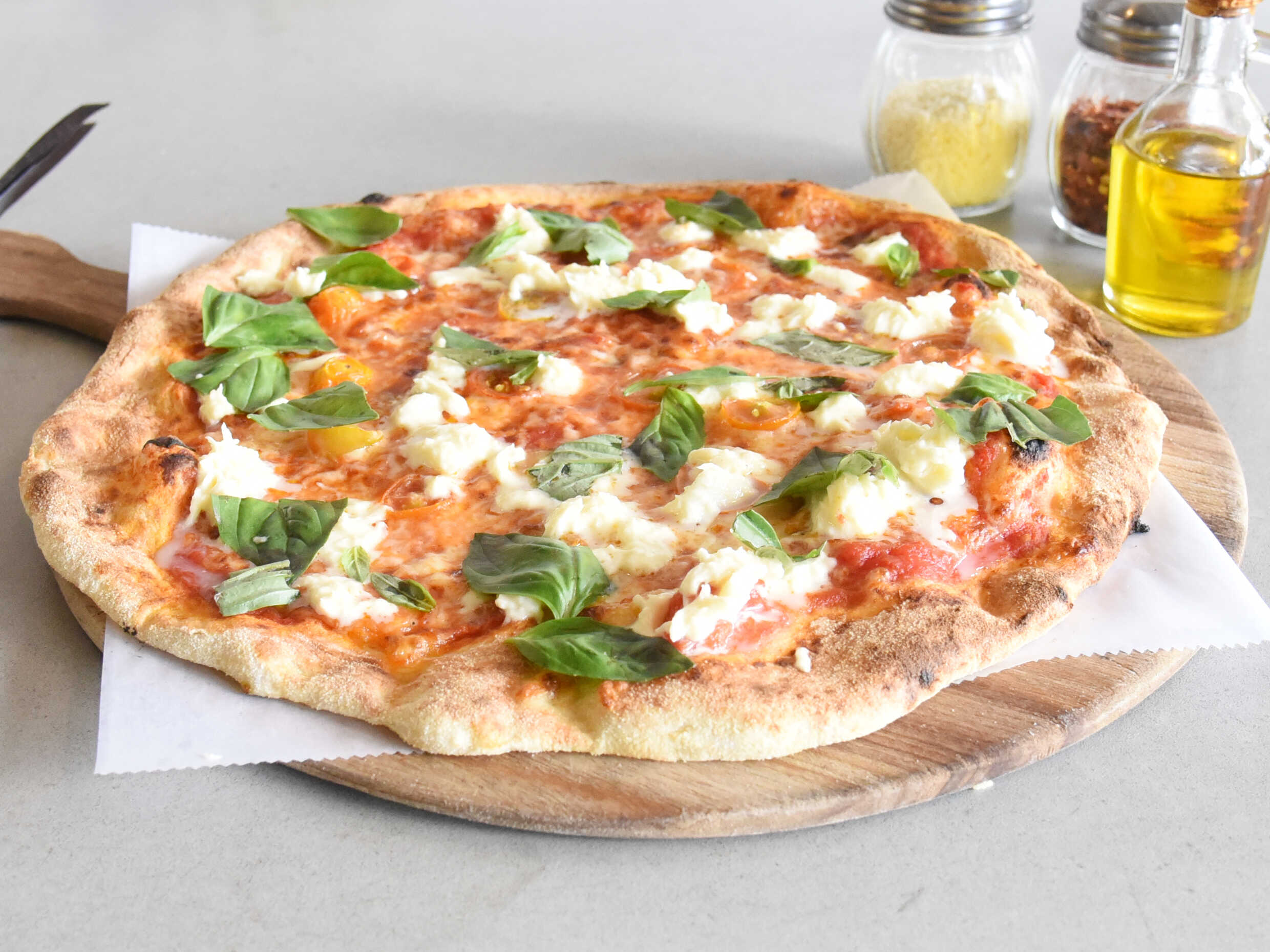 Clásica napolitana. Salsa de tomate natural, queso fior di latte, albahaca fresca y aceite de oliva extra virgen.