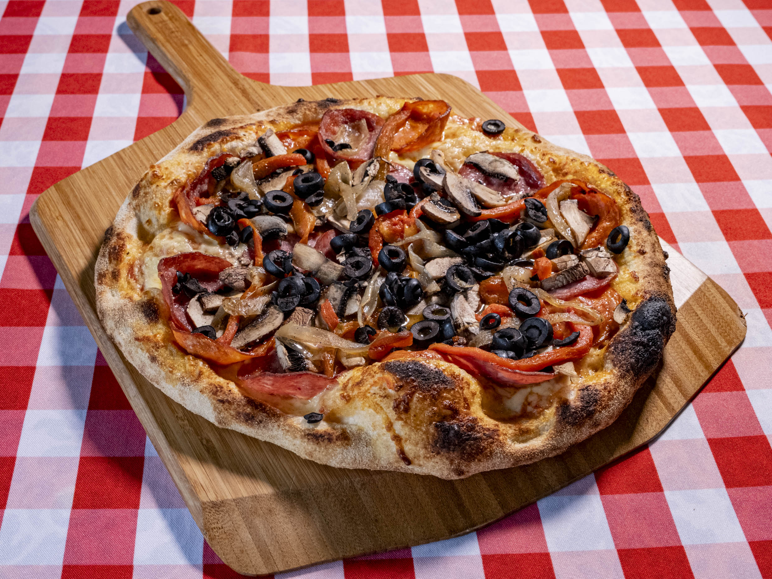 Salsa de tomate natural, queso mozzarella, salami, pepperoni, hongos crimini, aceitunas negras, chile asado y cebolla caramelizada.
