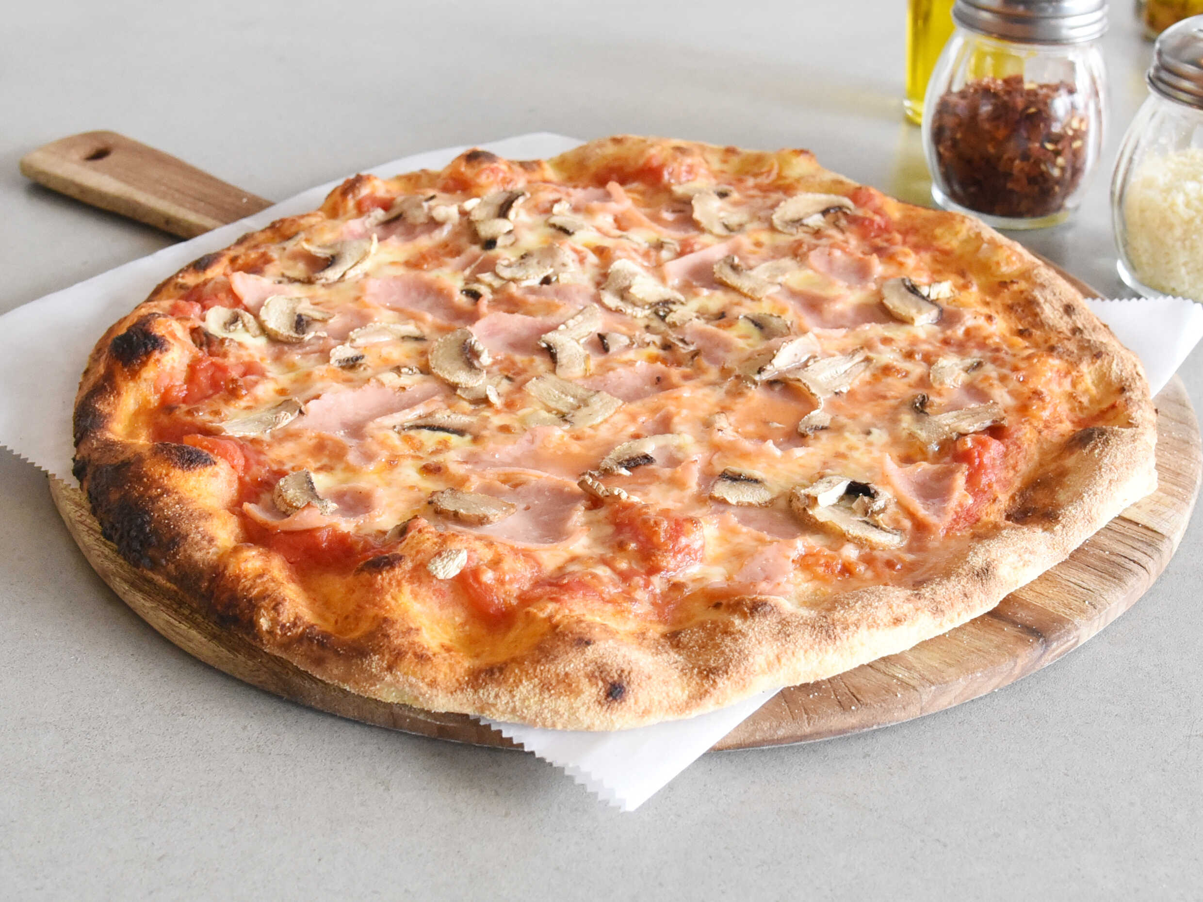 Salsa de tomate natural, queso mozzarella, jamón y hongos crimini frescos.