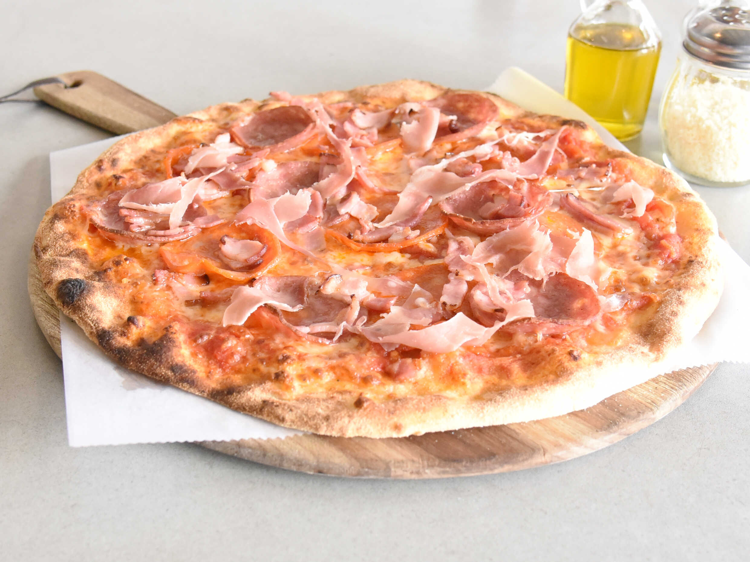 Salsa de tomate natural, queso mozzarella, tocineta, salami, pepperoni y prosciutto.