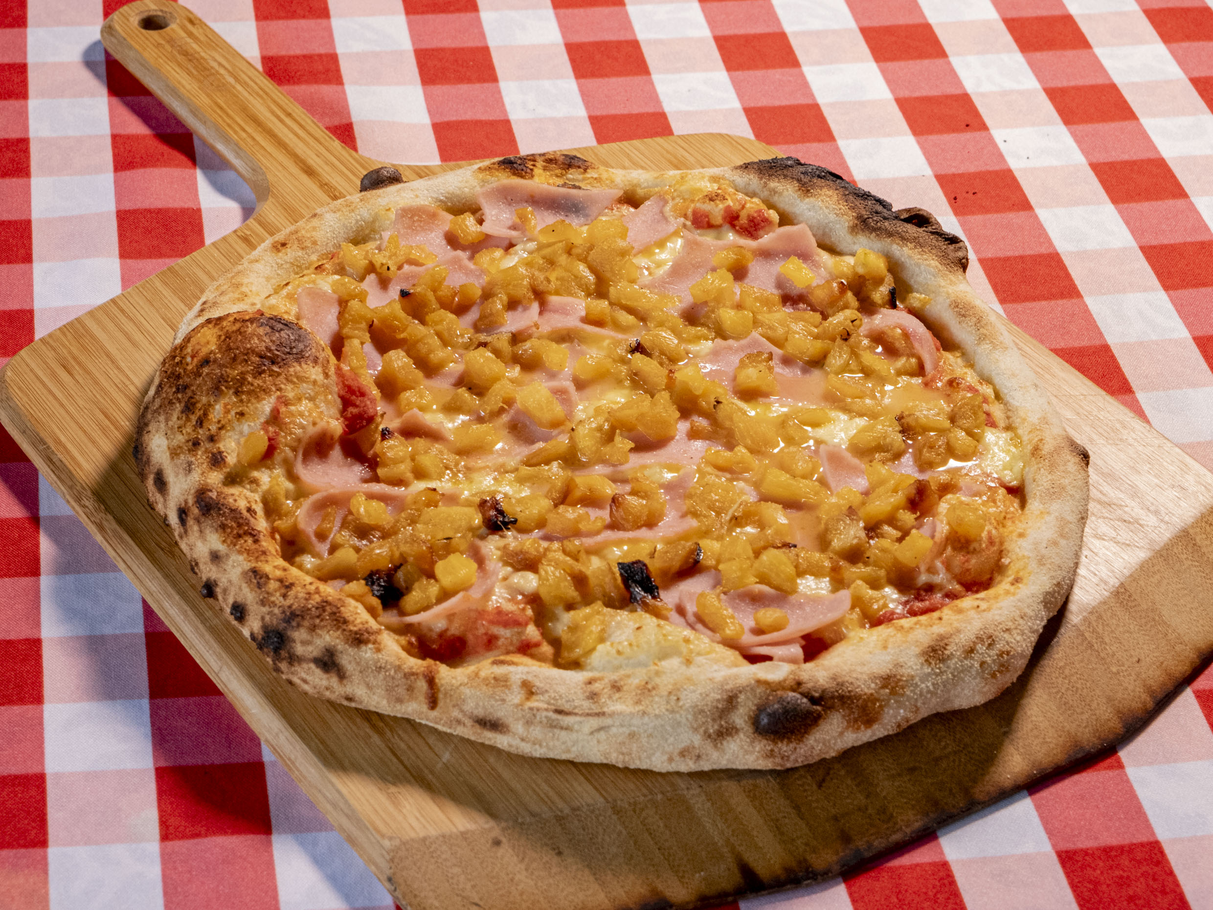 Salsa de tomate natural, queso mozzarella, jamón y piña al horno.