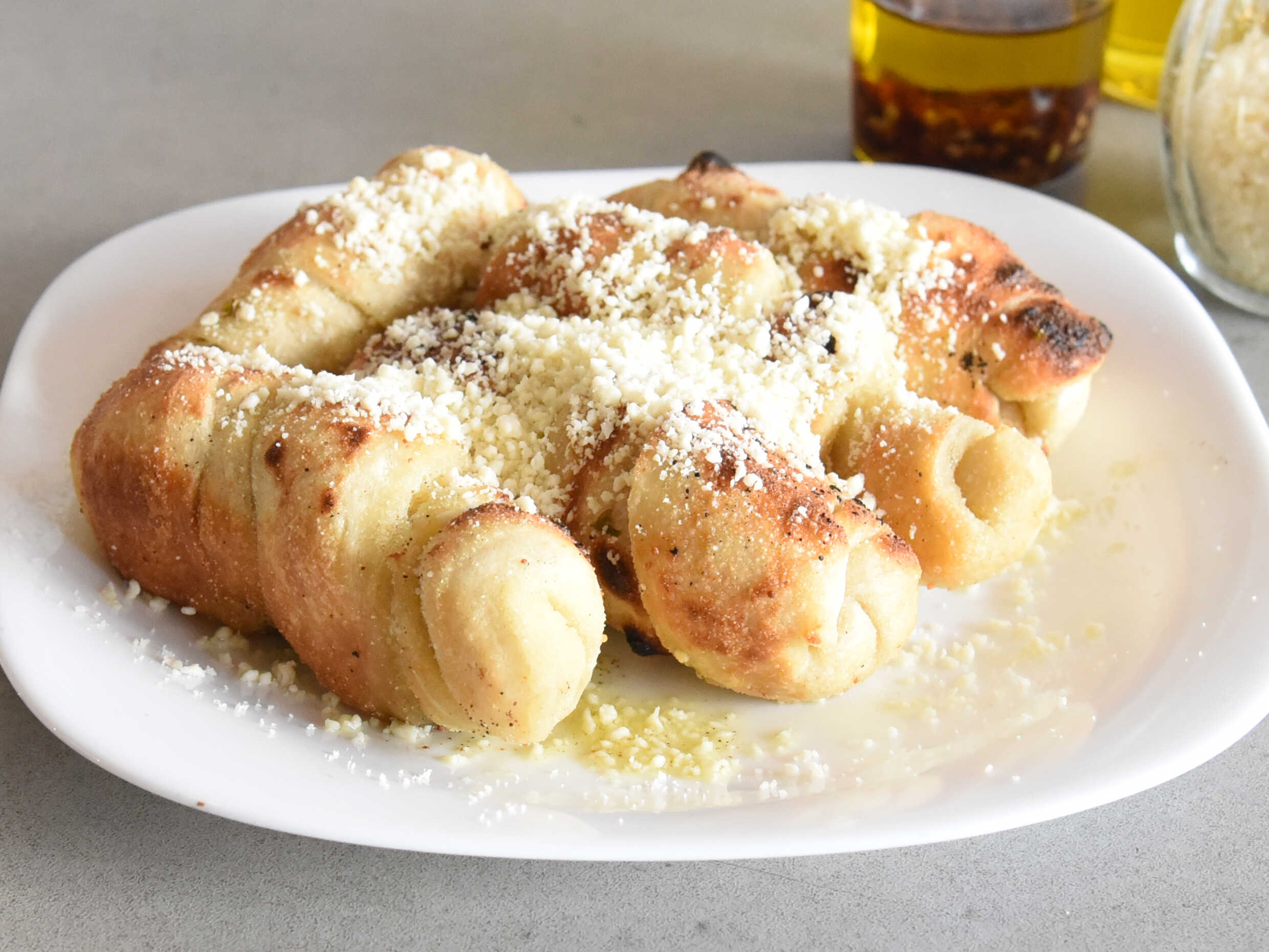 5 Deliciosos nuditos de pasta, cocinados en aceite de oliva extra virgen con ajo y espolvoreados con queso parmesano en polvo.