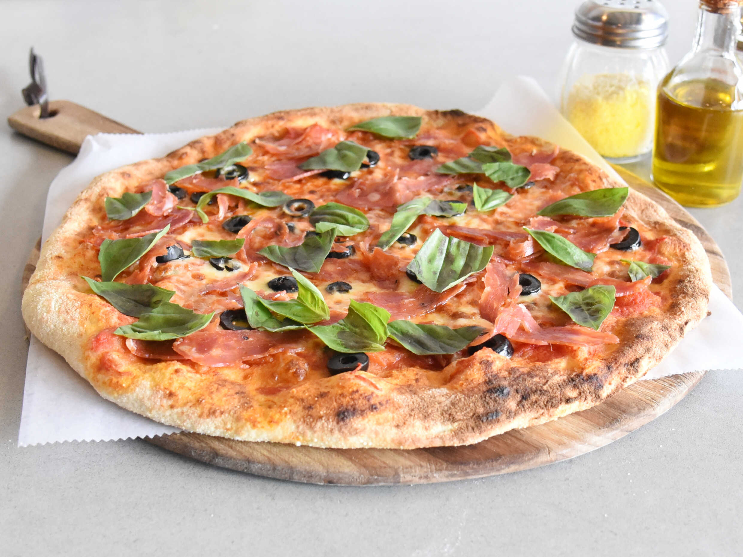 Salsa de tomate natural, queso mozzarella, salami italiano picante, aceitunas negras, aromatizado con albahaca y aceite de oliva extra virgen.