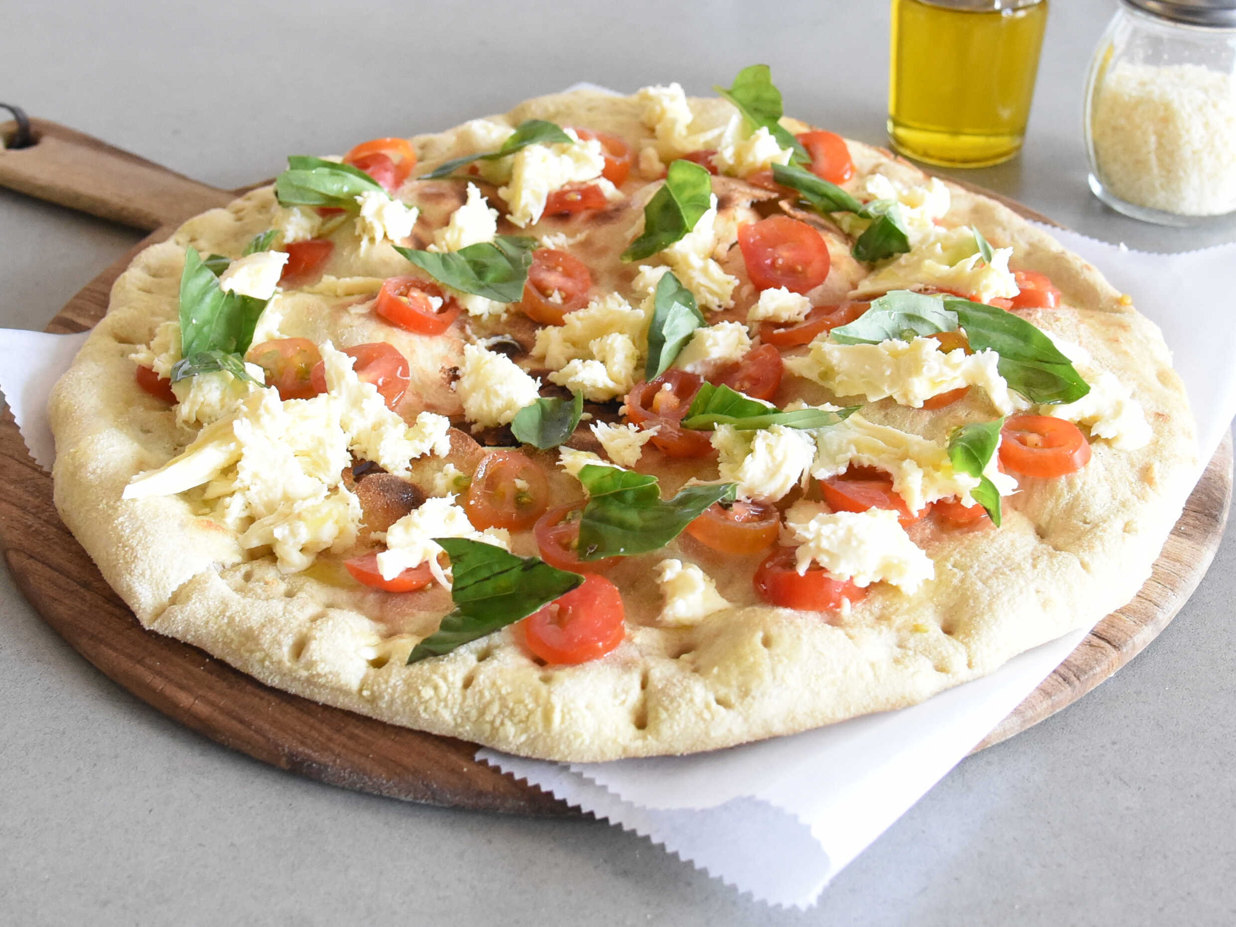 Salsa de tomate natural, queso fior di latte, queso mozzarella, albahaca fresca, tomate cherry y aceite de oliva extra virgen.