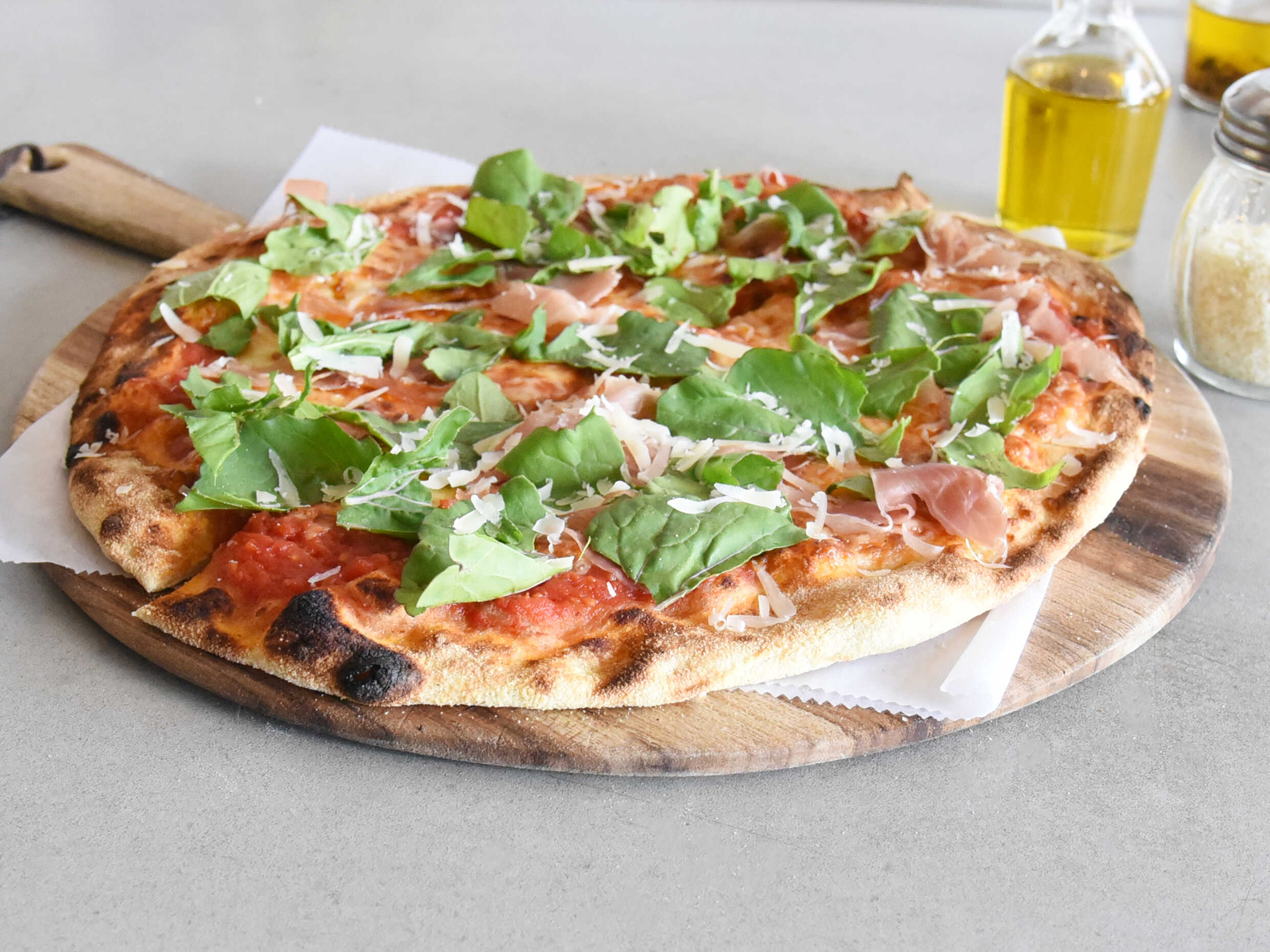 Salsa de tomate natural, queso mozzarella, prosciutto, arúgula, queso parmesano Grana Padano y aceite de oliva extra virgen.