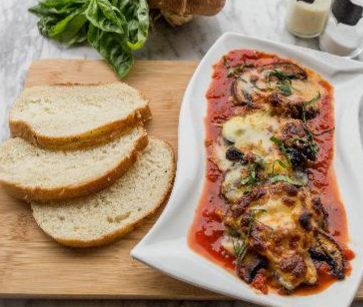 Lonjas de Hongo Portobello, sobre la cual se coloca salsa pomodor y pesto de albahaca, abundante queso motzarella y se lleva al horno a gratinar. Acompañado de pan de la casa