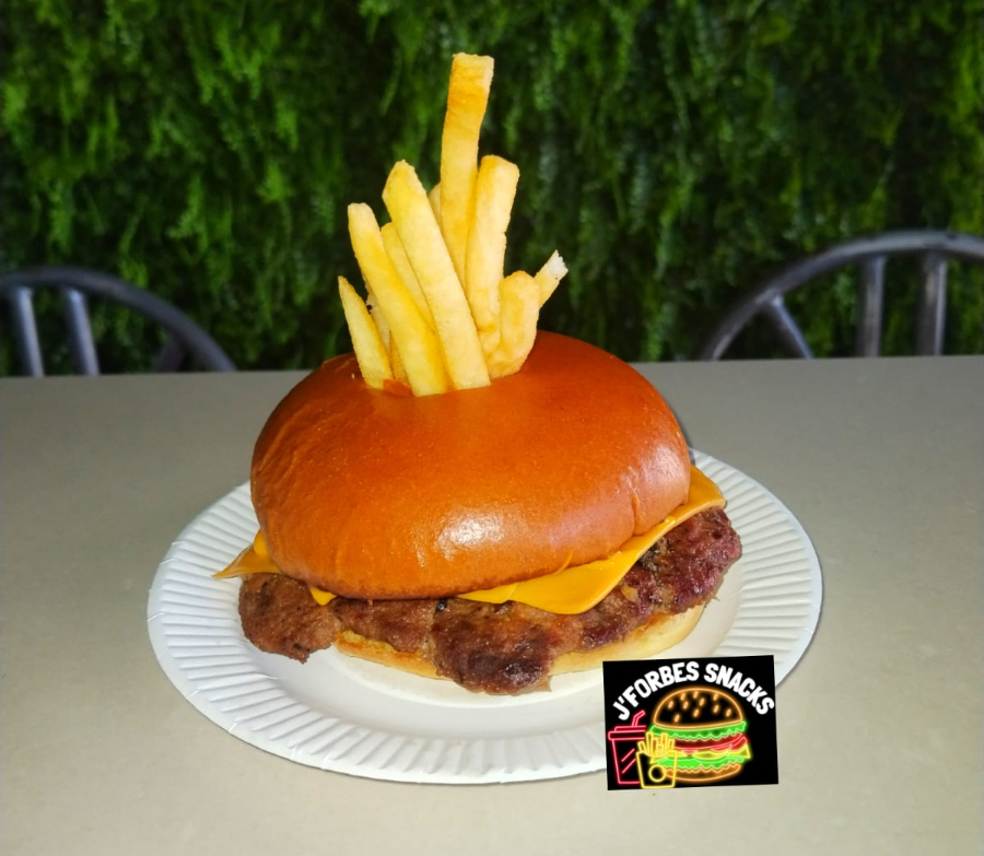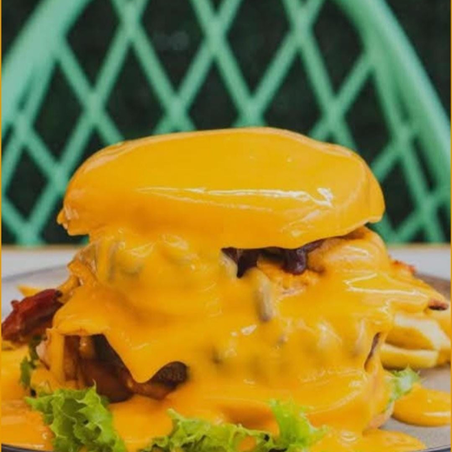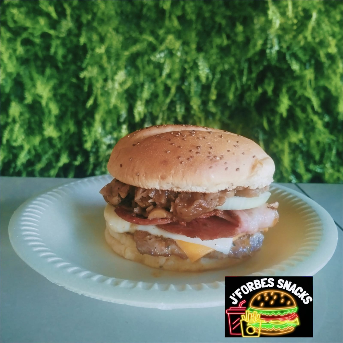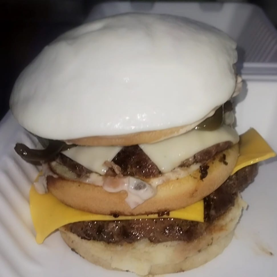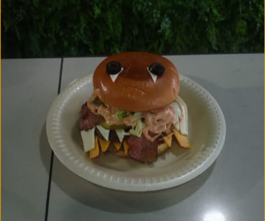 Pan de papa, torta de res, queso pepper jack, tocineta, jalapeños, cebolla crispy