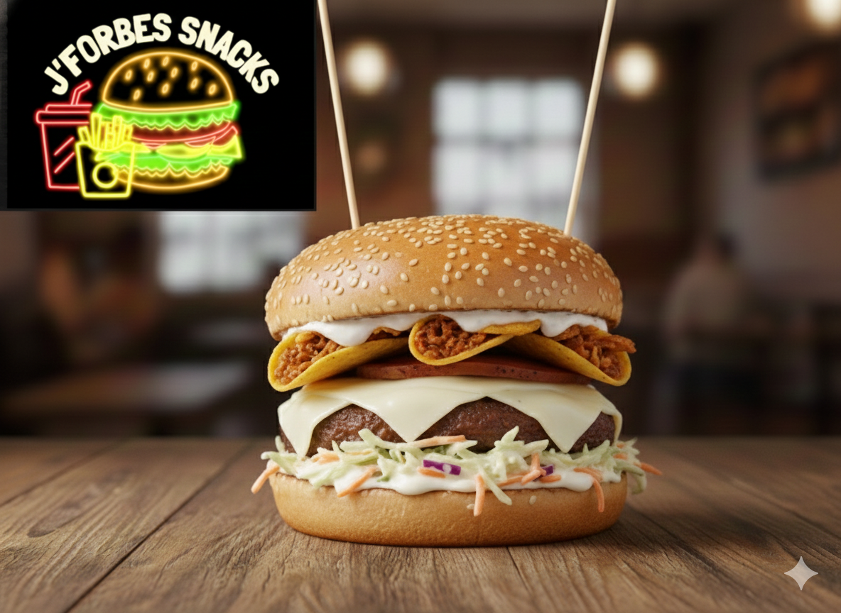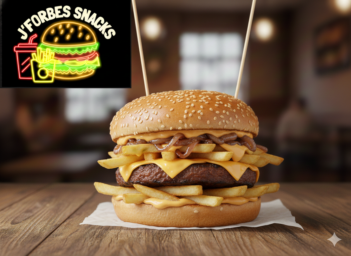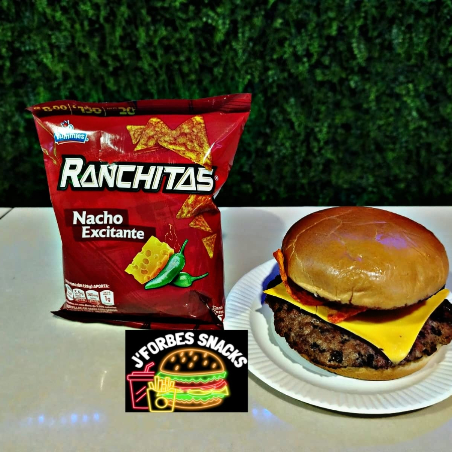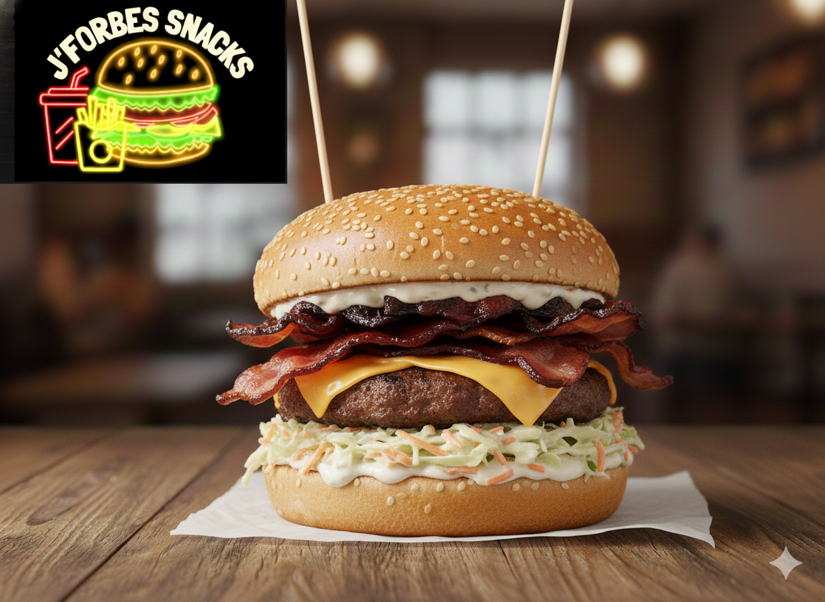 Pan de papa, torta de res, queso pepper jack, tocineta, jalapeños, cebolla crispy
