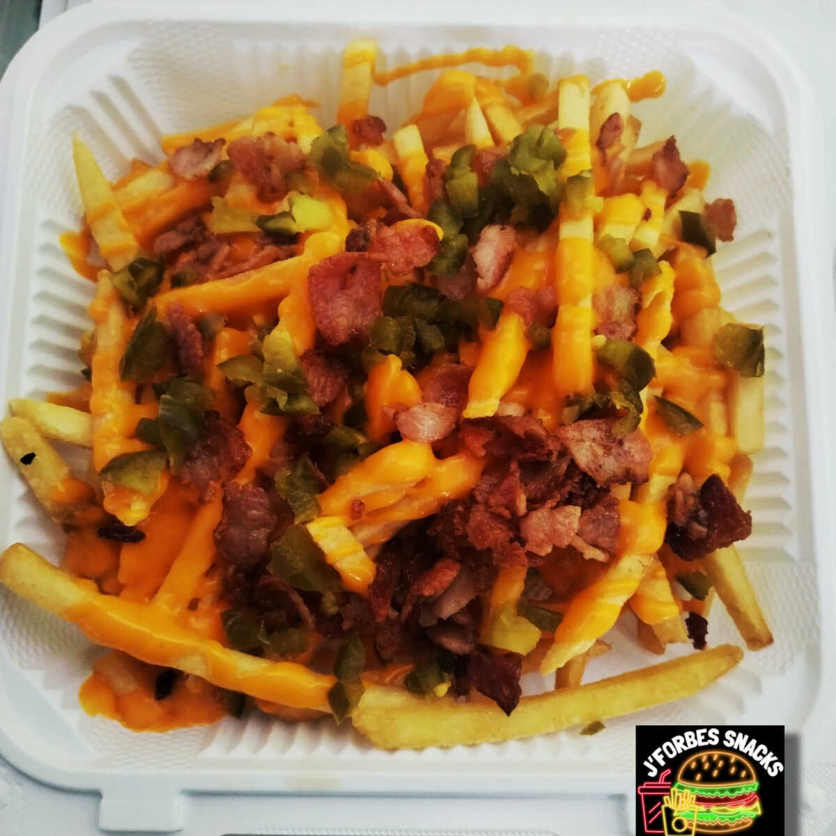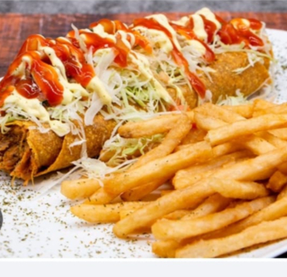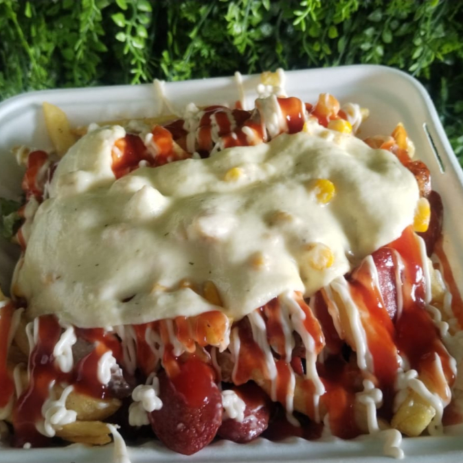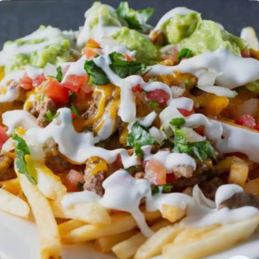 Papas fritas, carne molida, lechuga, pico de gallo, salsa tomate, mayonesa y salsa queso.