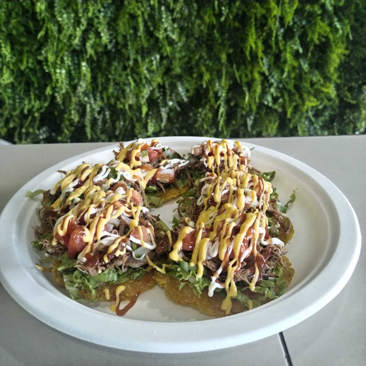 Cuatro patacones arreglados con carne desmechada, chimichurri, lechuga, salsa de tomate, mayonesa y salsa queso.