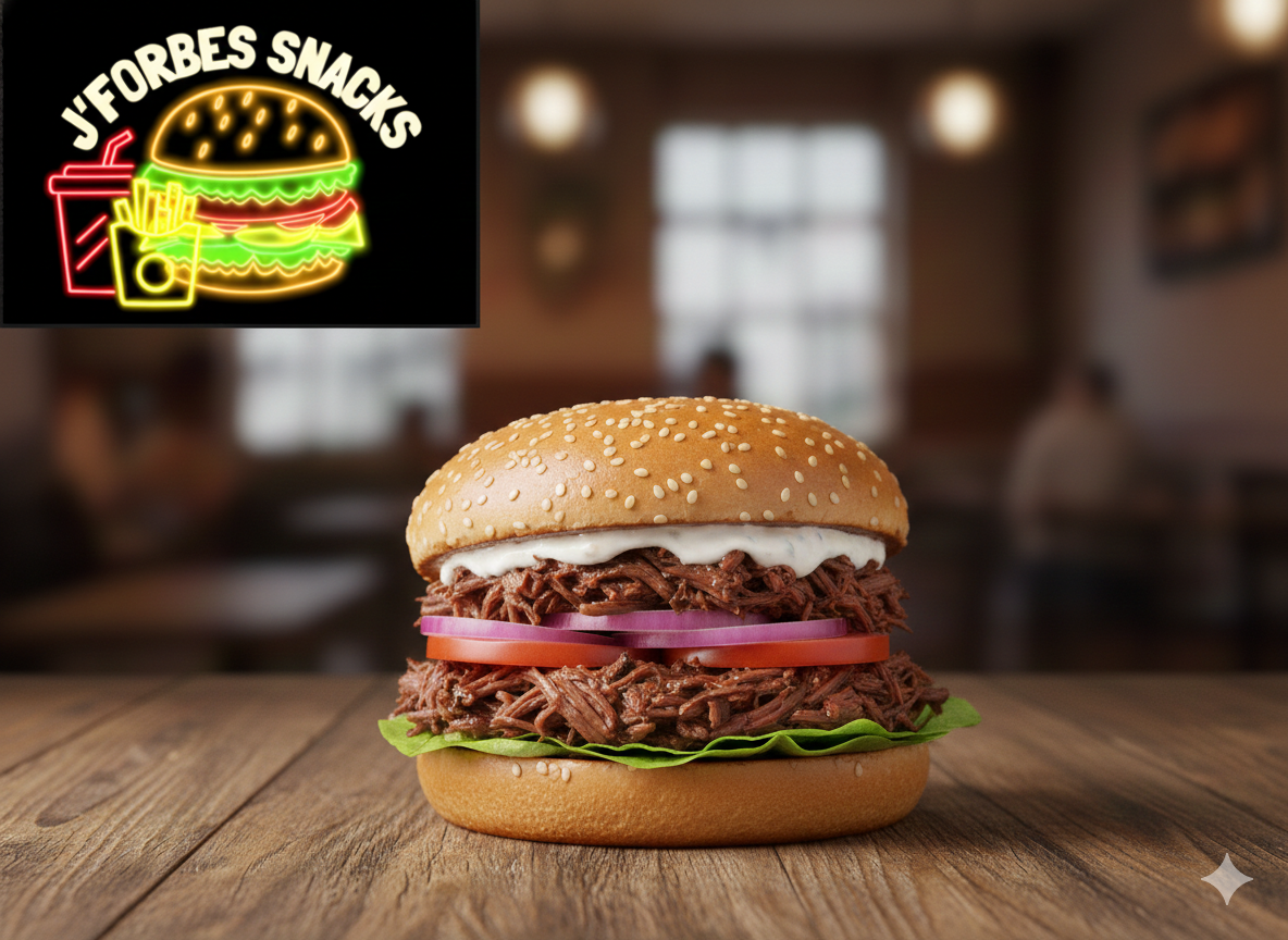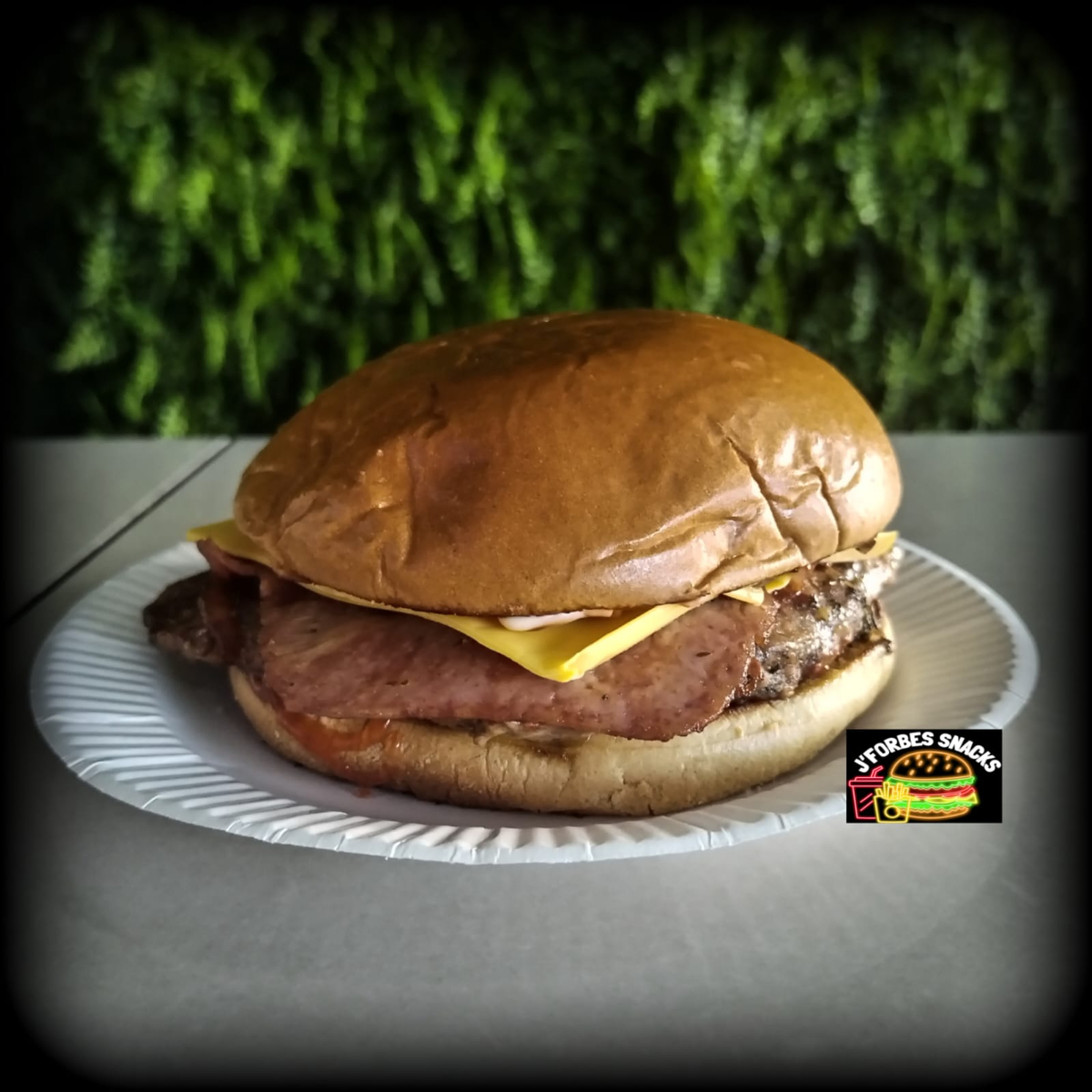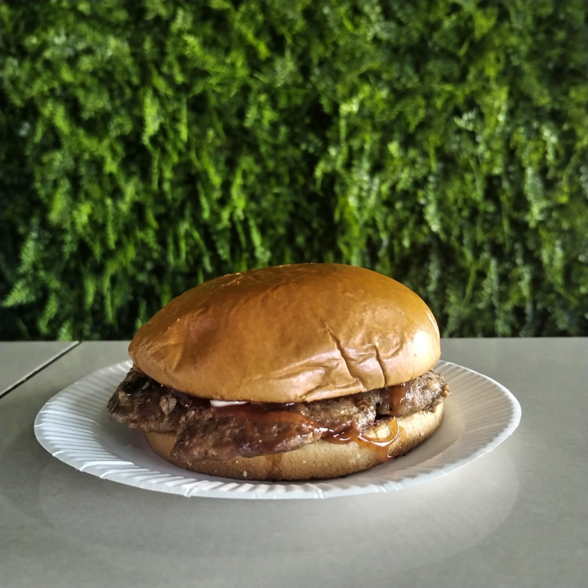 Pan de papa, torta de res a la BBQ, queso amarillo, tocineta, cebolla, hongos en salsa de hongos.