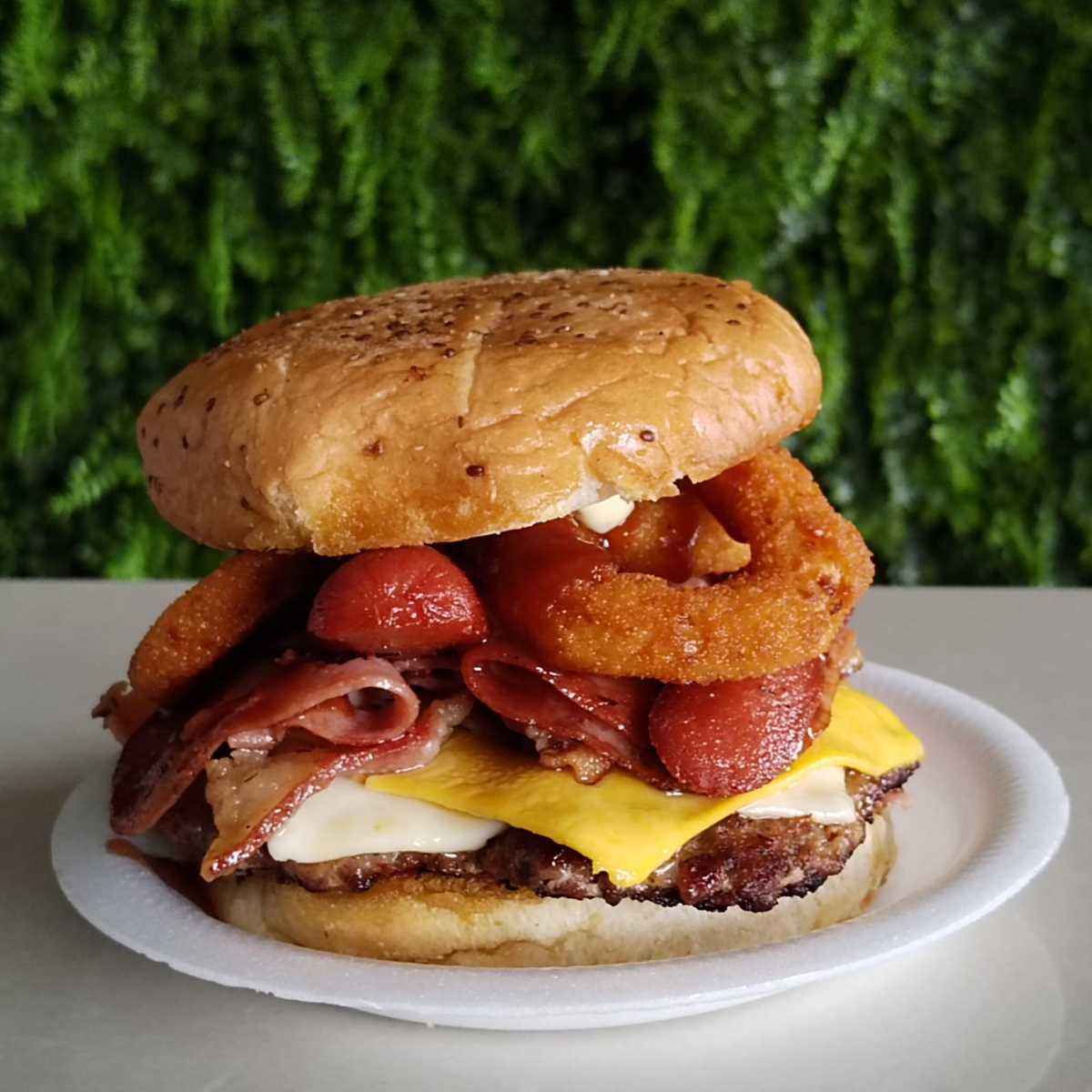 Pan de papa, torta de res, queso blanco, queso amarillo, tocineta, aros de cebolla, jamon, salchicha y salsa A-1