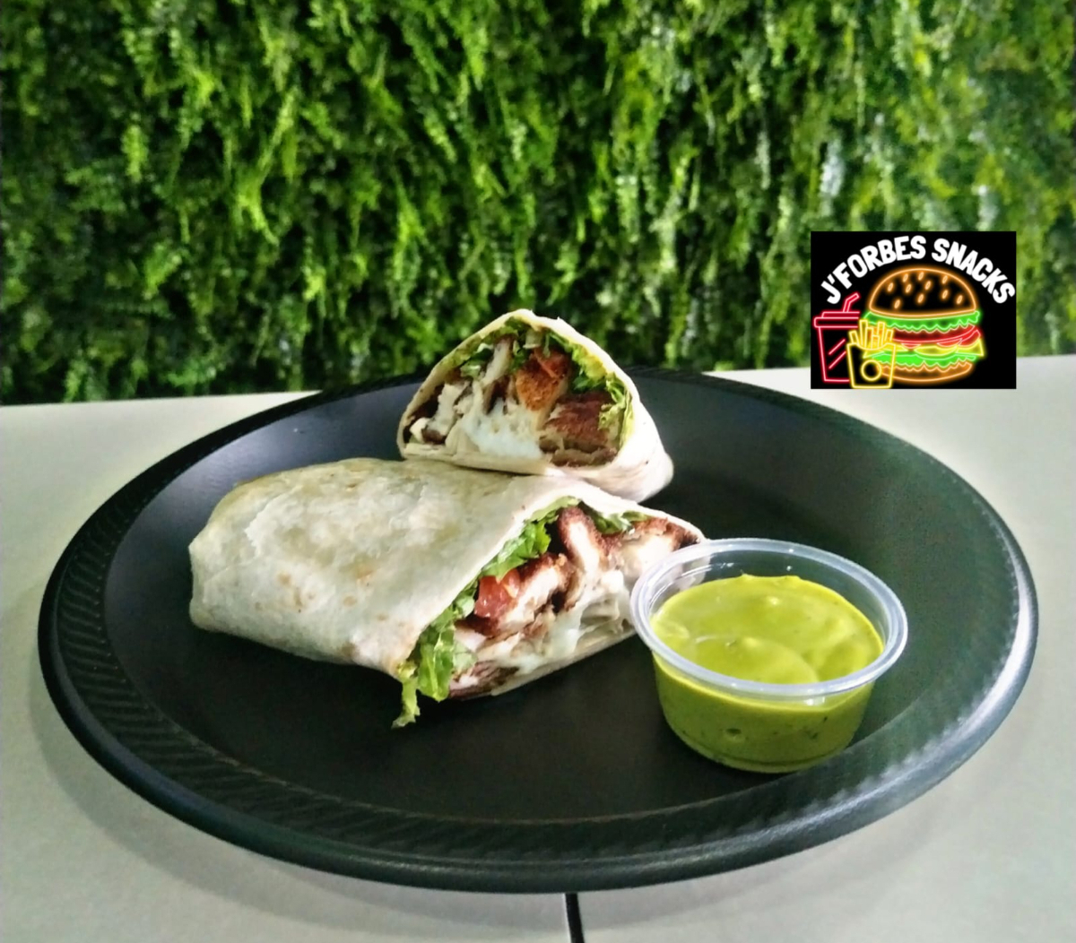 Tortilla, salsa, pollo, lechuga, tomate, queso.
