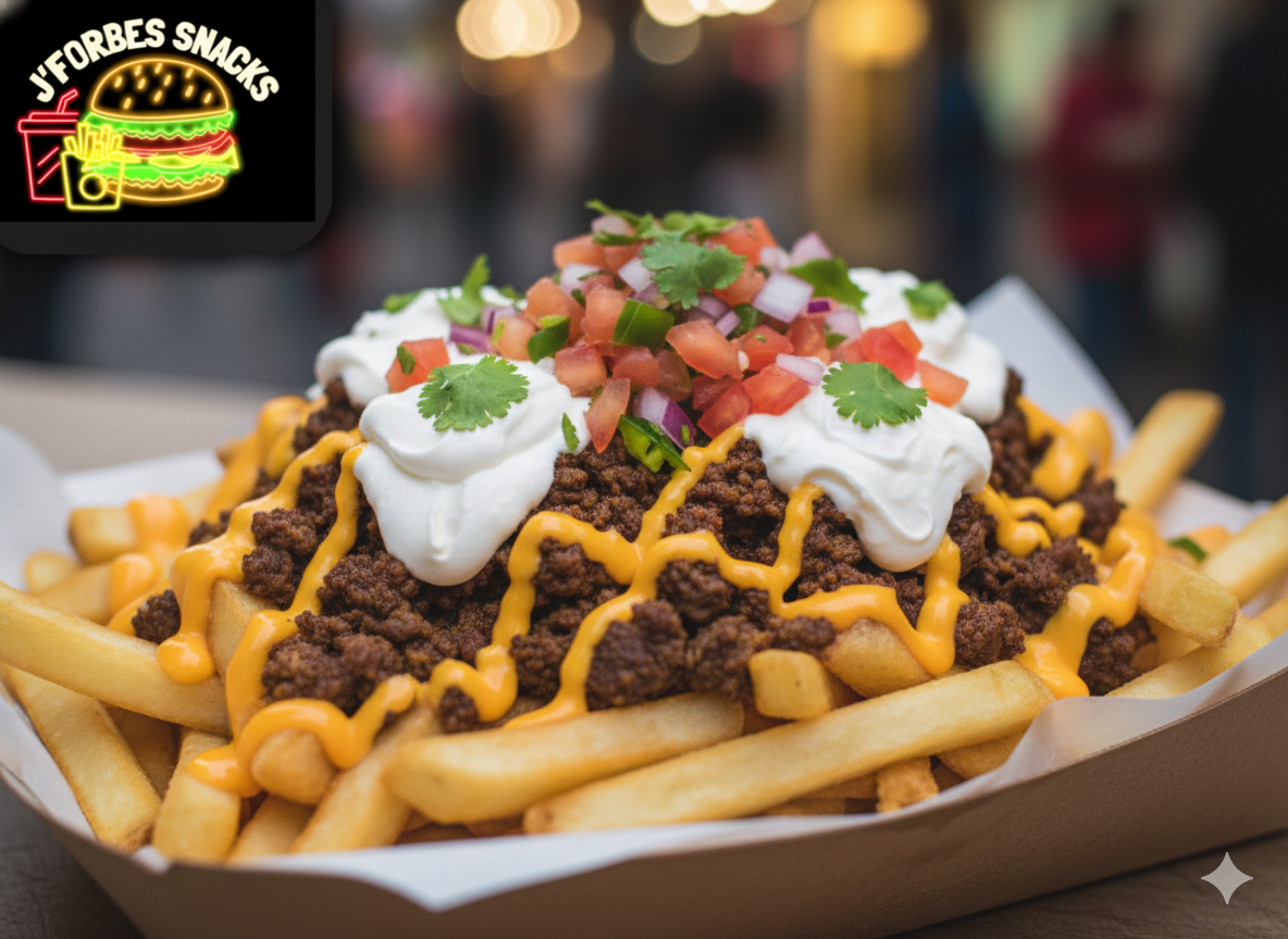 Torta, queso, papas, salsa queso, cebolla cocinada.
