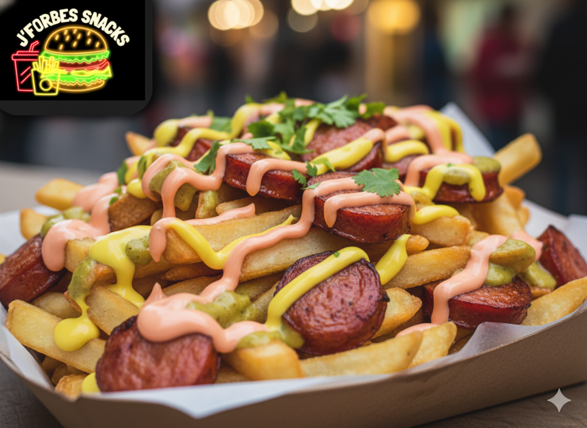 Papas, salchichas, chorizo, salami, queso mozzarella.