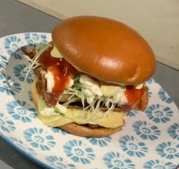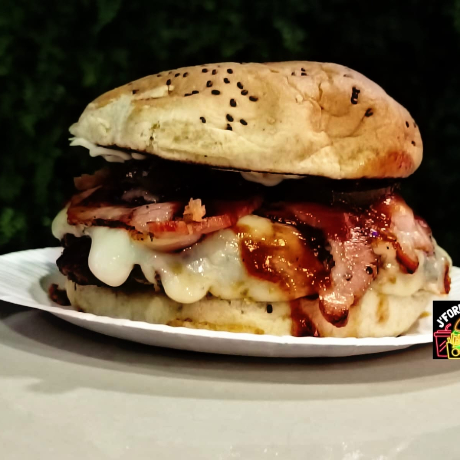 Pan de papa, torta de res a la BBQ, queso blamco, tocineta y cebolla.
