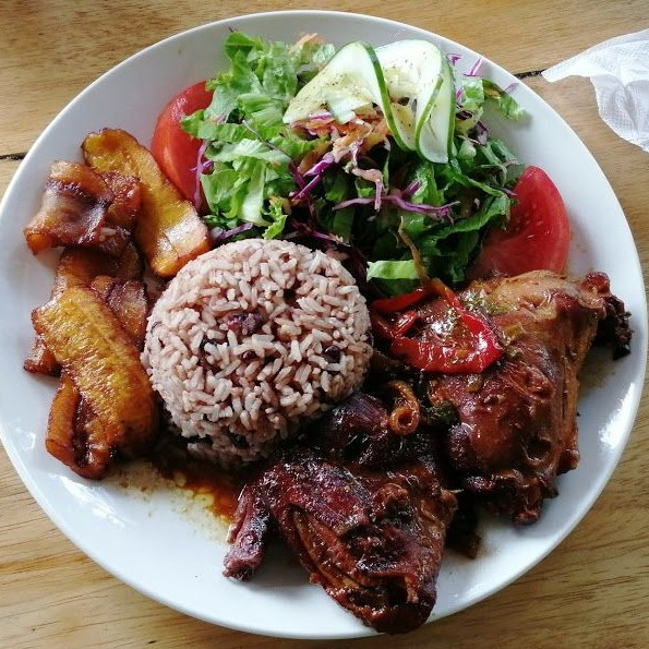Rice and beans, 1 piezas de pollo ensalada y maduros