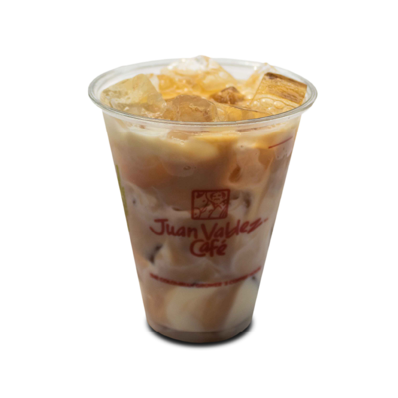 Bebida preparada a base de cafe espresso y leche fria, saborizante de canela y vainilla servida sobre hielo.