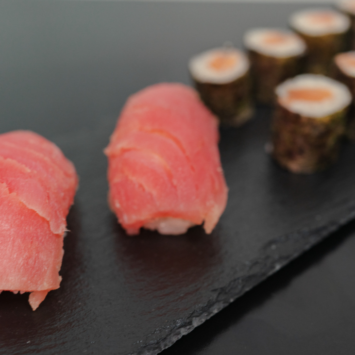 2 Nigiris de salmón fresco, 2 nigiris de salmón ahumados, 1 nigiri de atún y 1 nigiri de aguacate.