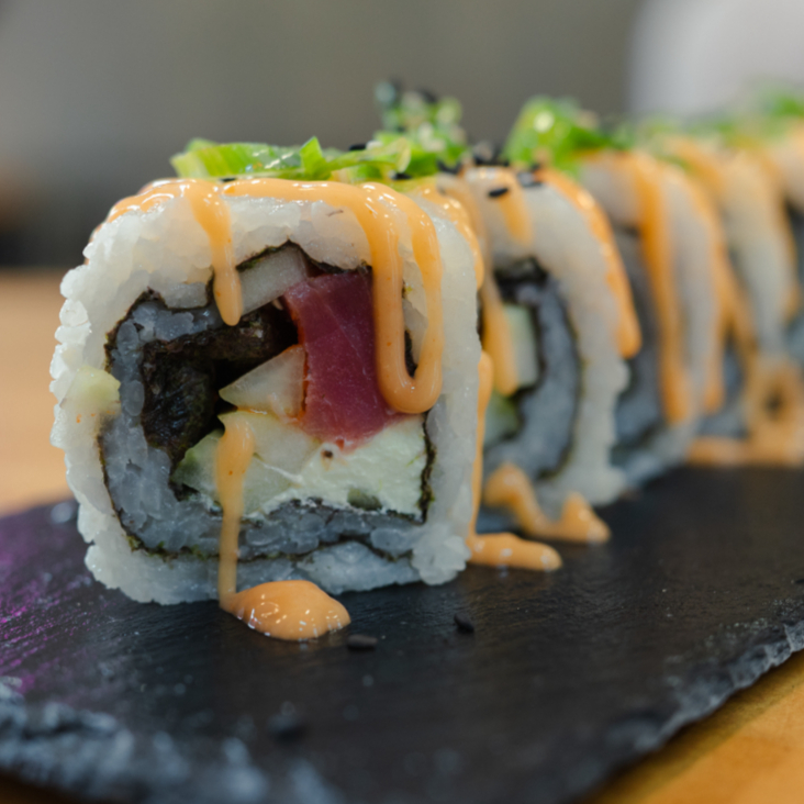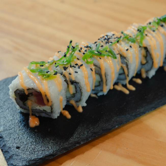 Atún picante, pepino y queso crema. Cobertura de spicy mayo y cebollín. Todos incluyen 8 bocados.