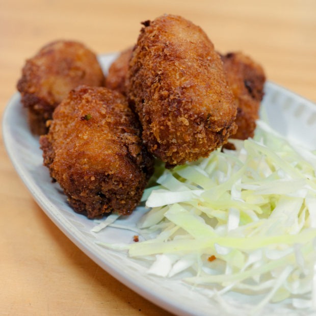Croquetas de papa con curry, empanizada en panko. Acompañada de salsa tonkatsu.
