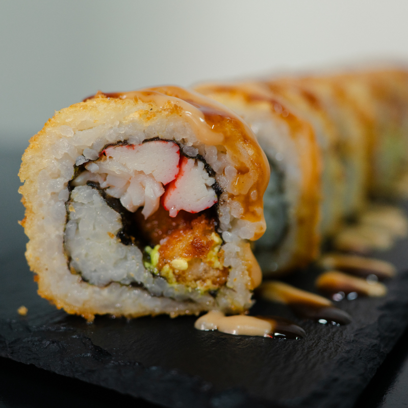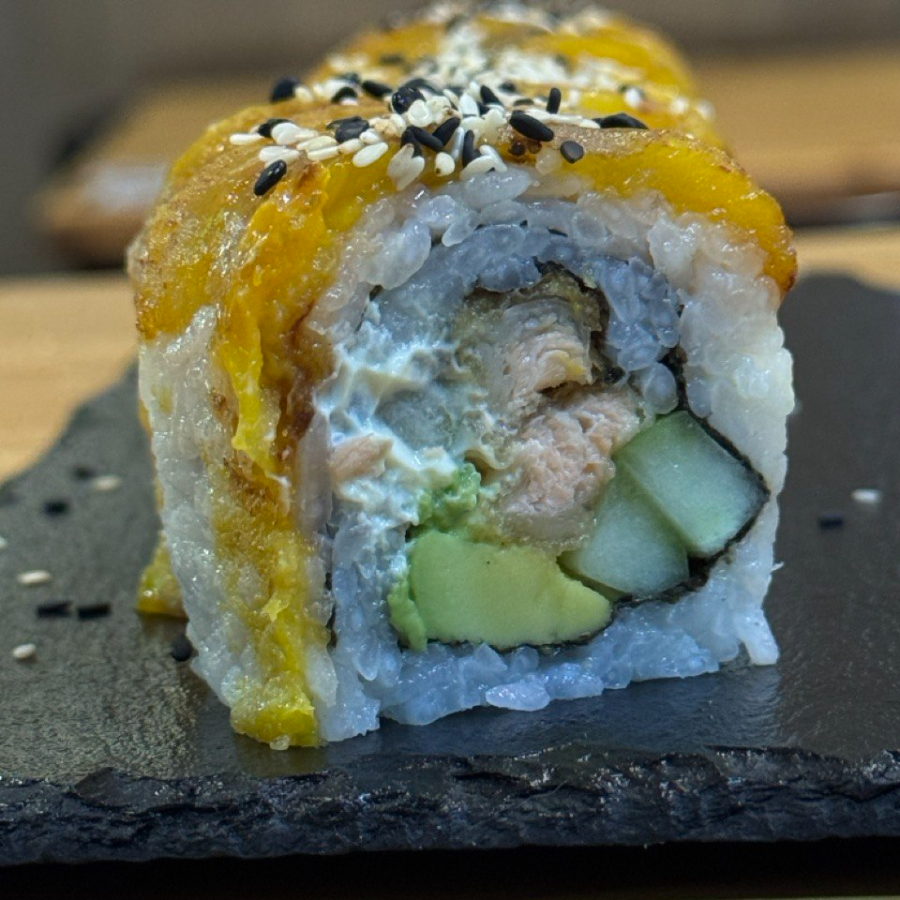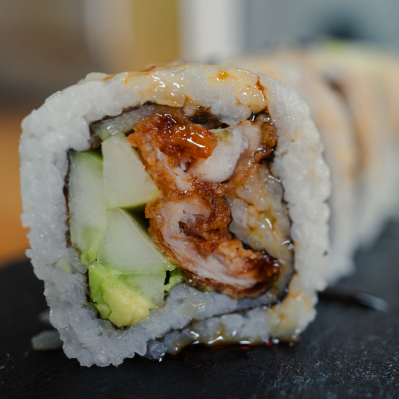 Pollo panko, mostaza miel, aguacate y pepino. Cobertura de salsa teriyaki. Todos incluyen 8 bocados.