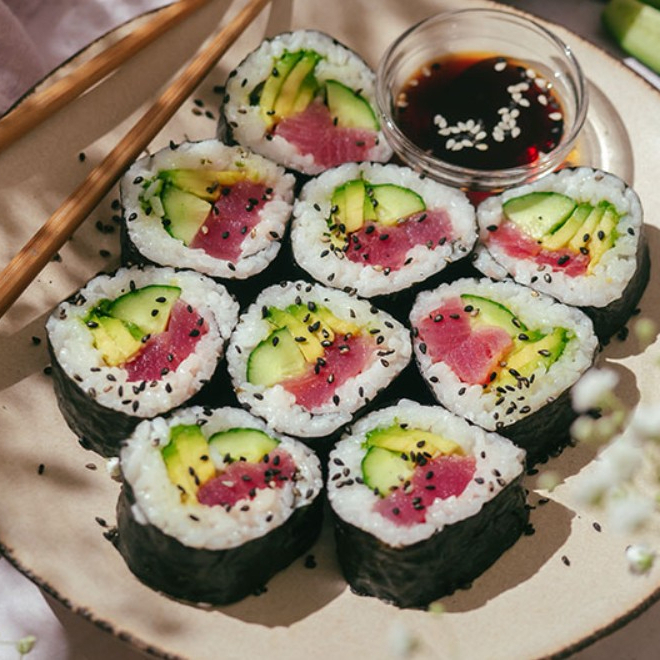Atún fresco, cebollín y aguacate. Todos incluyen 8 bocados.