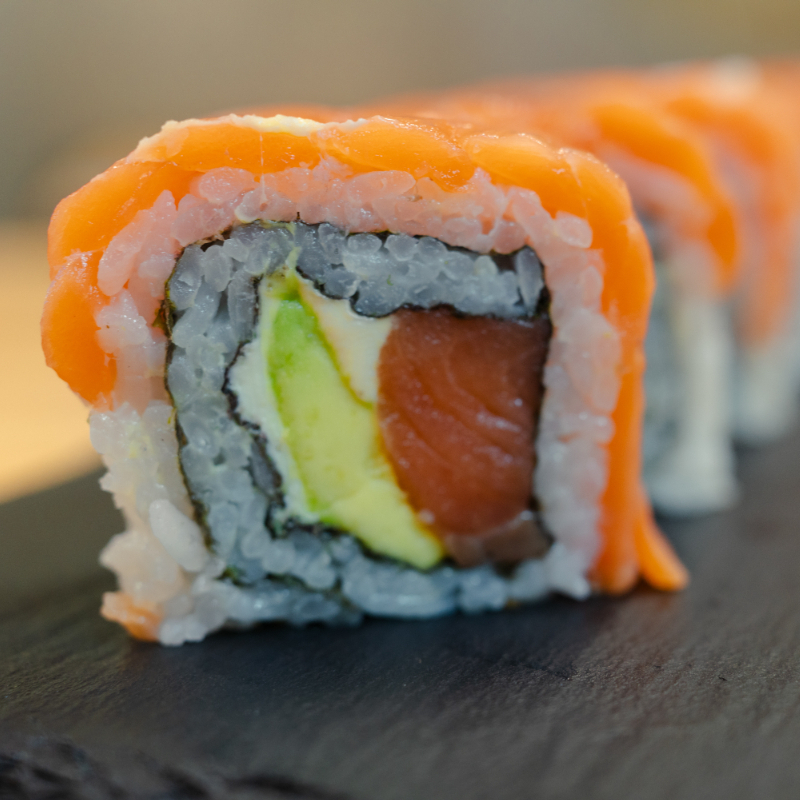 Salmón fresco, aguacate y queso crema. Cobertura de salmón ahumado y salsa ponzu. Todos incluyen 8 bocados.