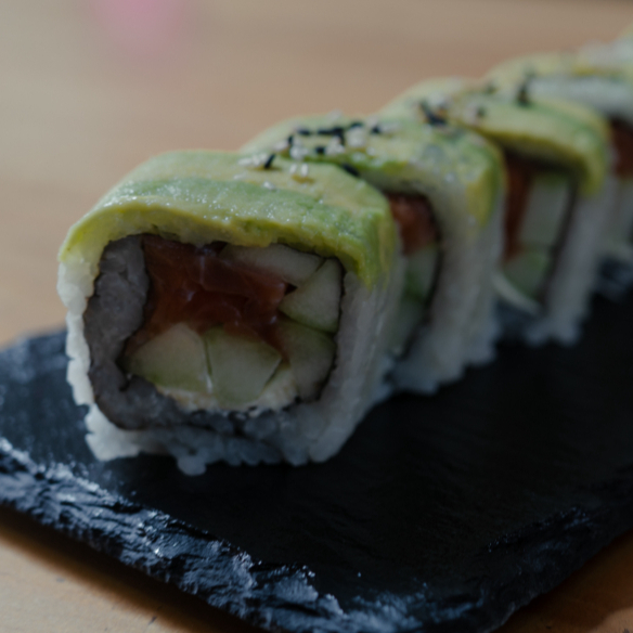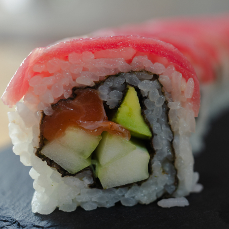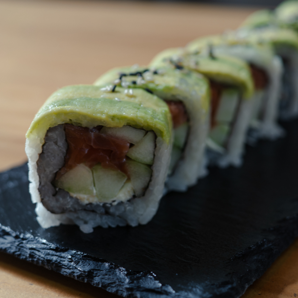Salmón fresco, aguacate y pepino. Cobertura de atún. Todos incluyen 8 bocados.