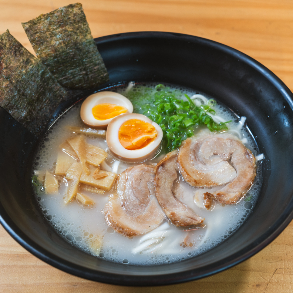 Delicioso ramen con fideos de trigo, caldo tonkotsu (de cerdo) hecho en casa a fuego lento por más de 8 horas, con chashu (cerdo marinado), ajitama (huevo marinado), nori, hongo negro y cebollín fresco. Sabor intenso y reconfortante.