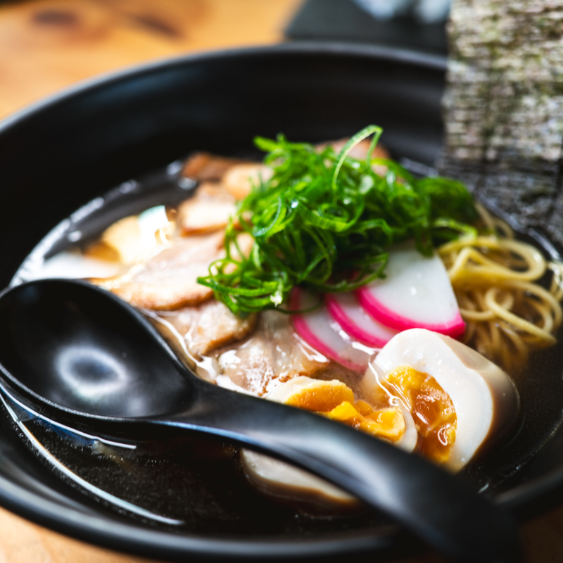 Ramen estilo clásico con fideos de trigo, caldo de pollo y salsa de soya japonesa. Incluye chashu (cerdo prensado), ajitama (huevo marinado), alga nori, cebollín, y kamaboko. Ligero pero lleno de umami.