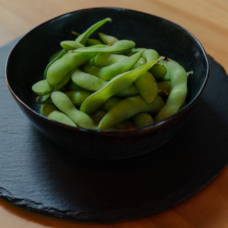 Pollo empanizado al estilo japonés bañado en salsa de naranja, sobre arroz gohan, acompañado de repollo verde fresco, tomate cherry, zanahoria, chips de yuca y edamames.