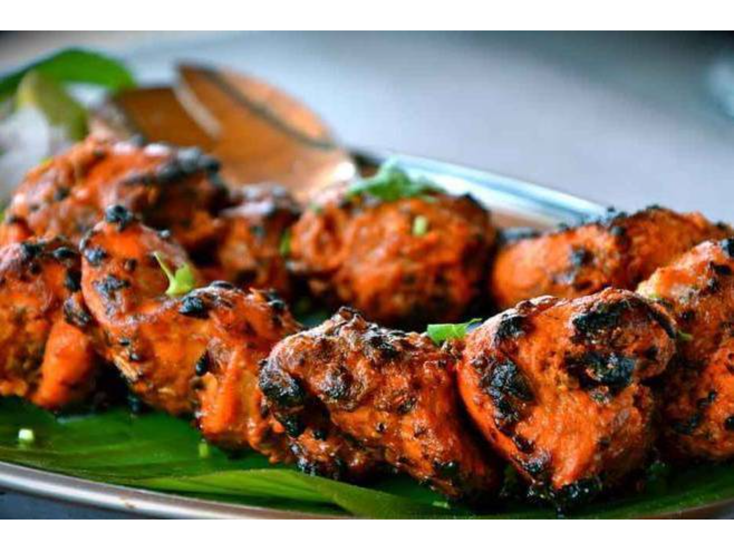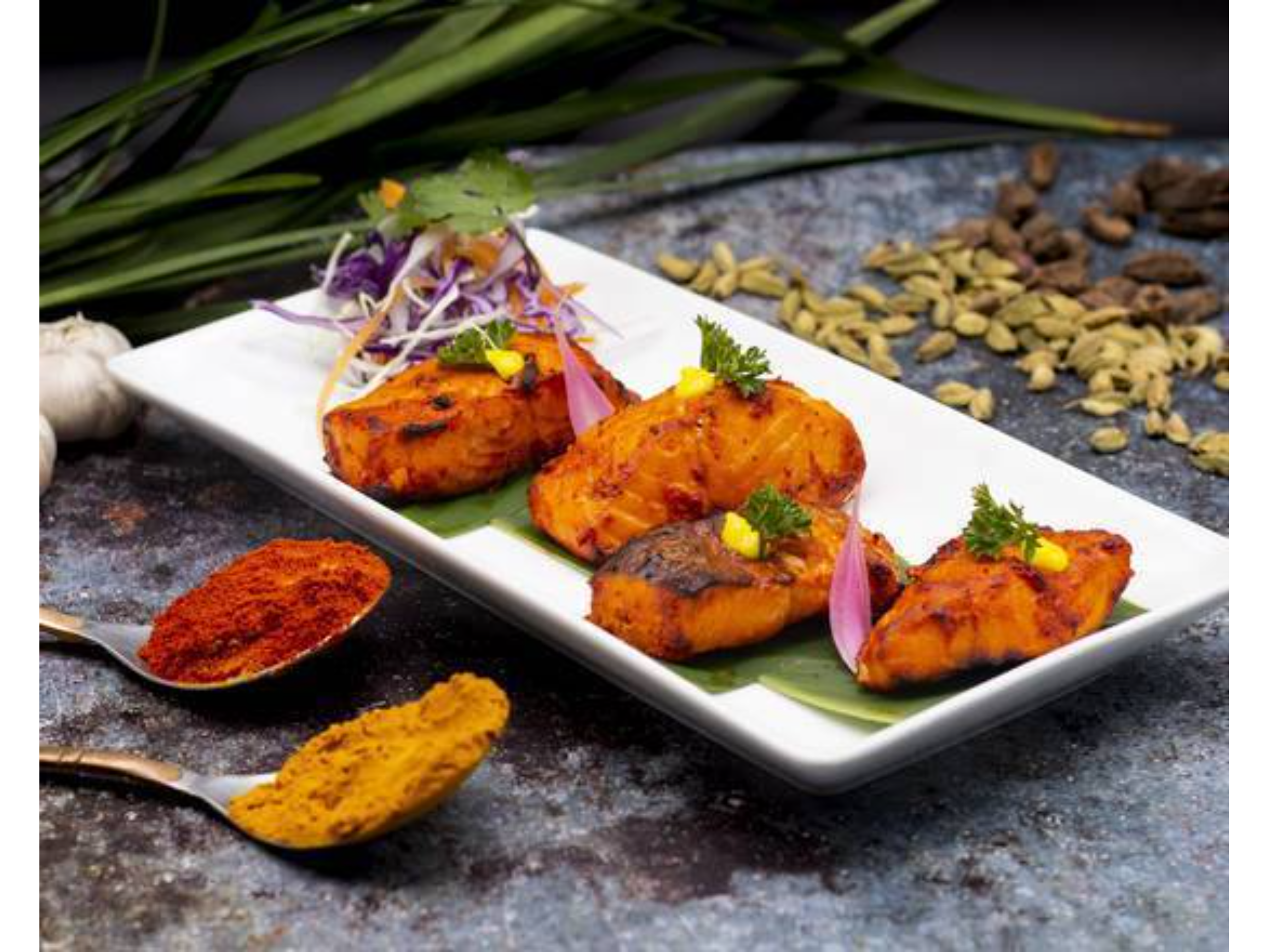 Salmon filet pieces marinated with garlic, turmeric & ginger; smoked in tandoor.